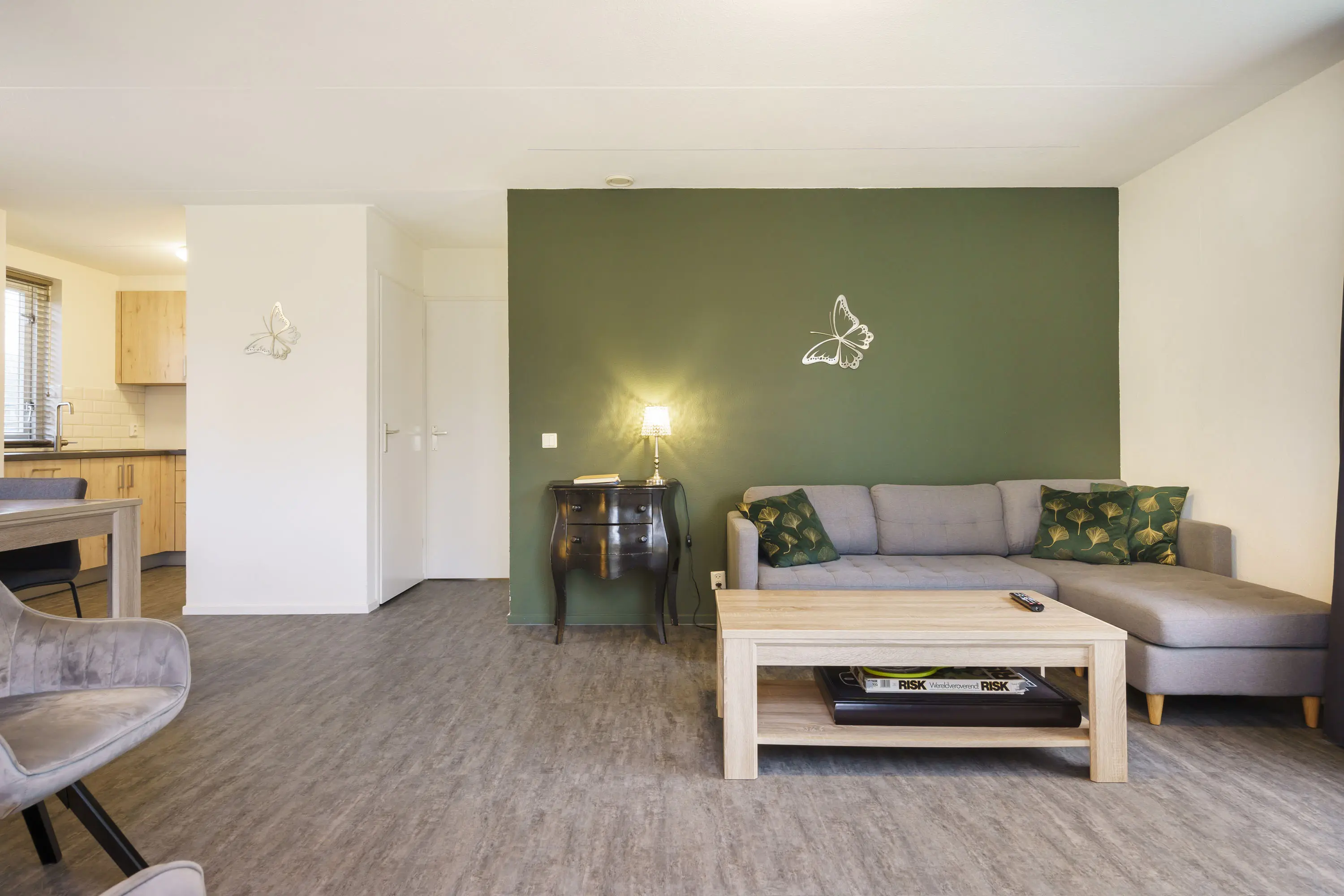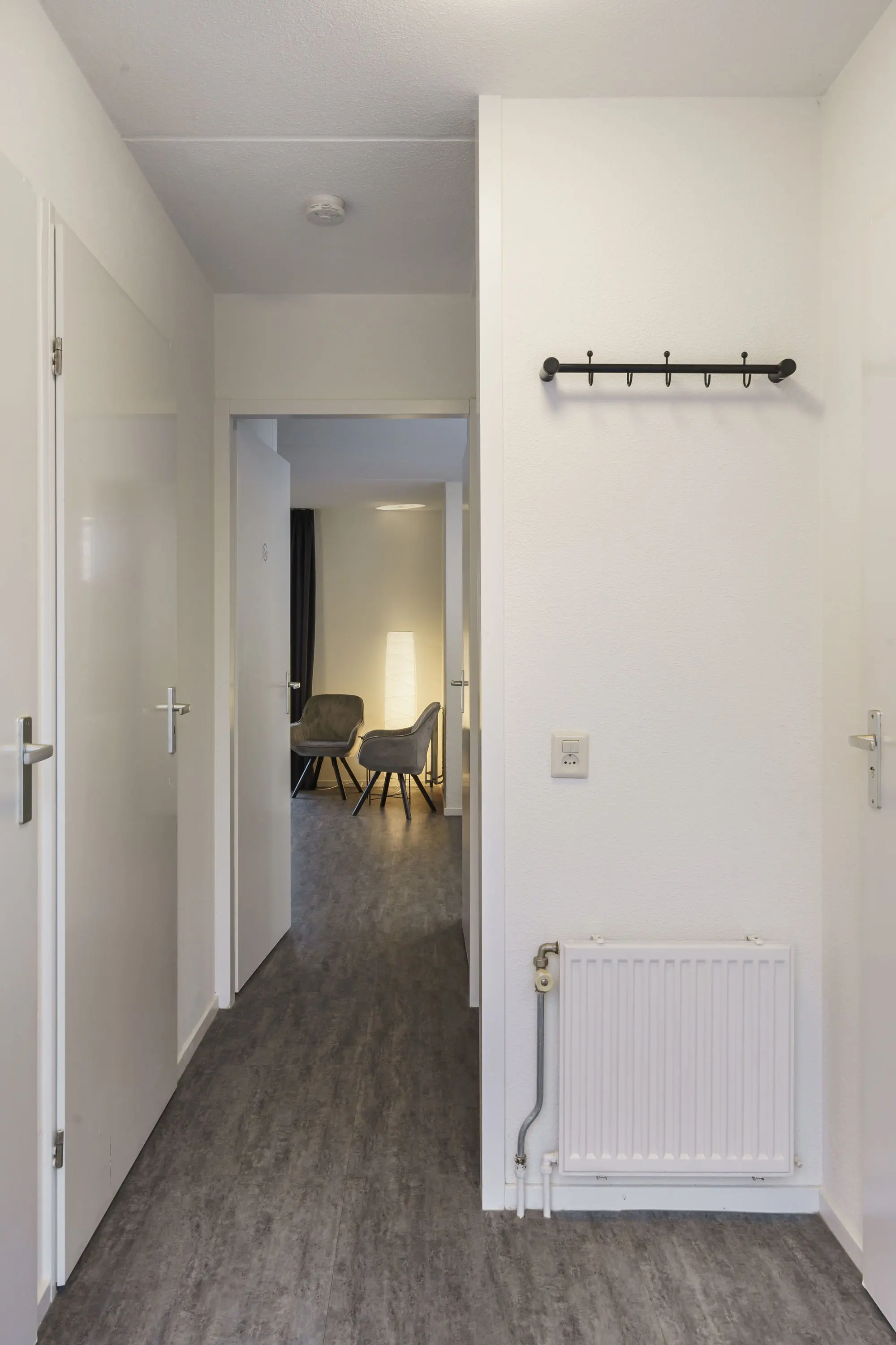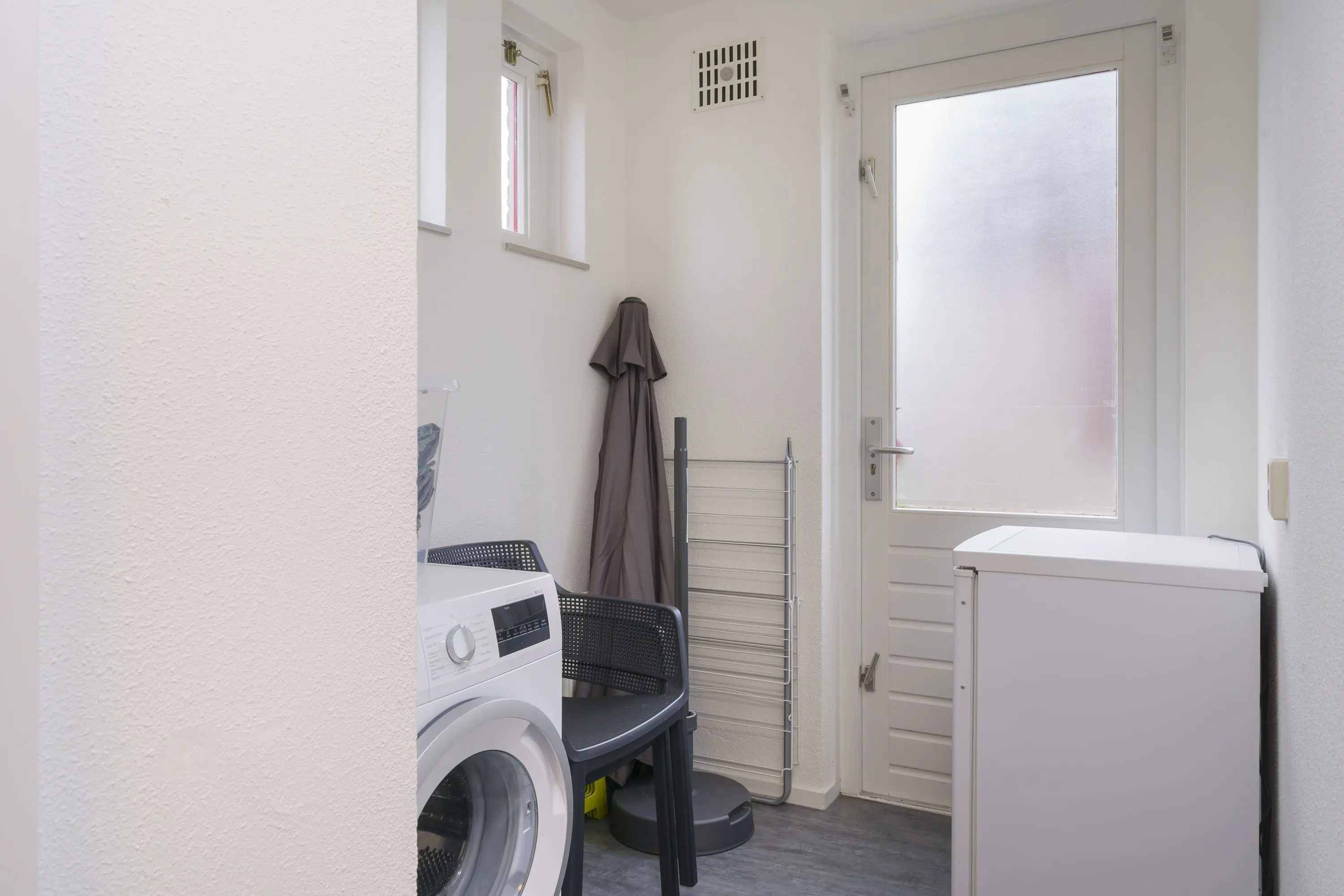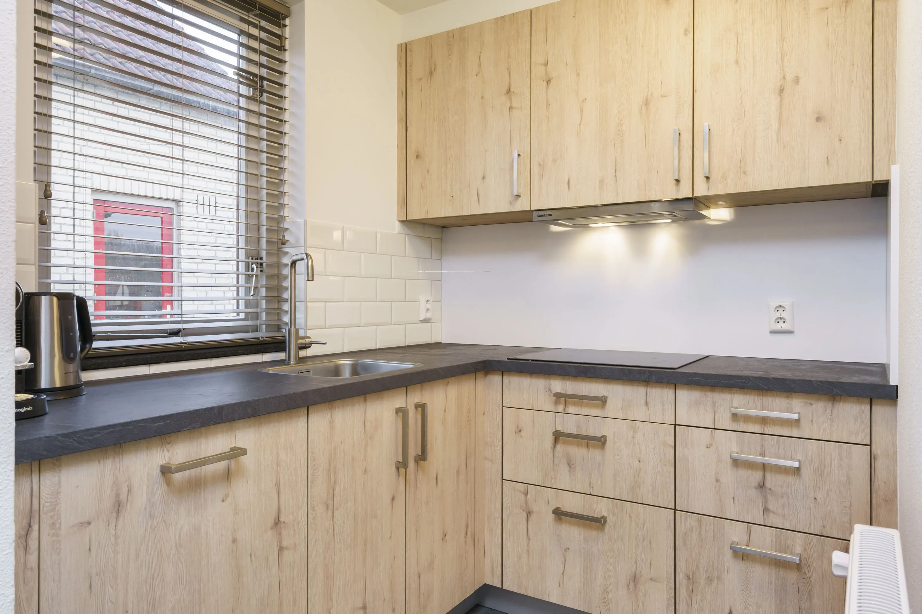 Entree, hal, meterkast, separaat toilet (hangend), bijkeuken met witgoedaansluitingen, badkamer met wasmeubel, designradiator en inloopdouche, slaapkamer I, ruime tuingerichte woonkamer met halfopen keuken welke is voorzien van diverse inbouwapparatuur zoals een inductiekookplaat, vaatwasser en koelkast.