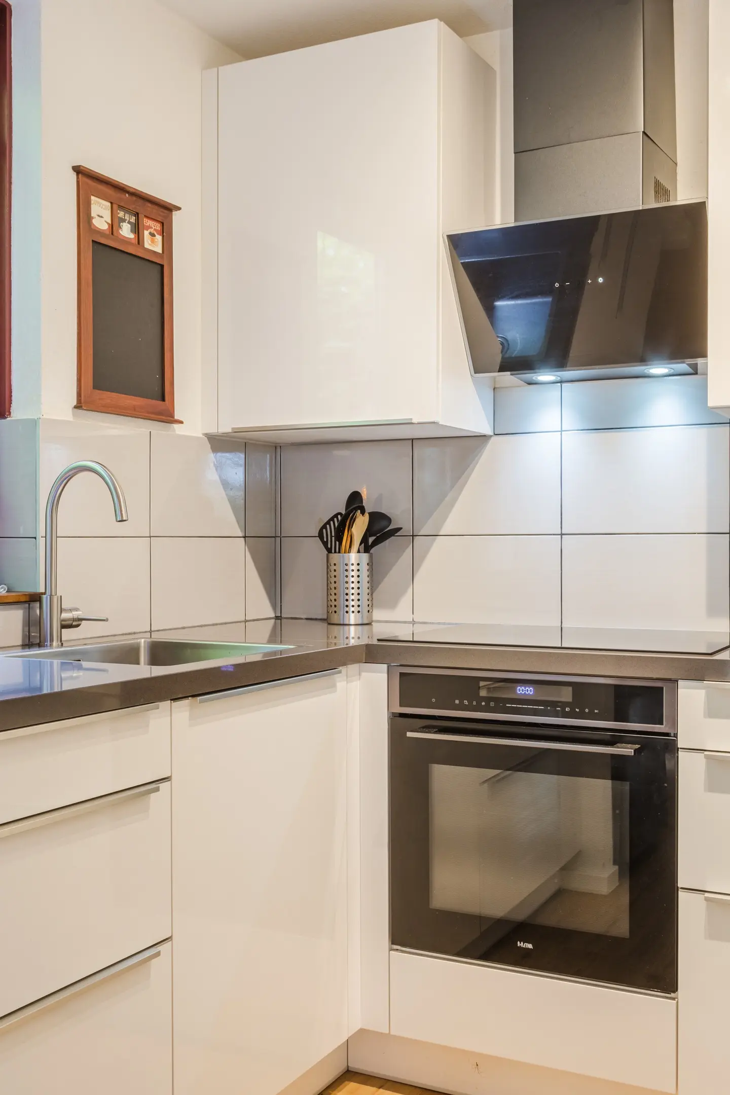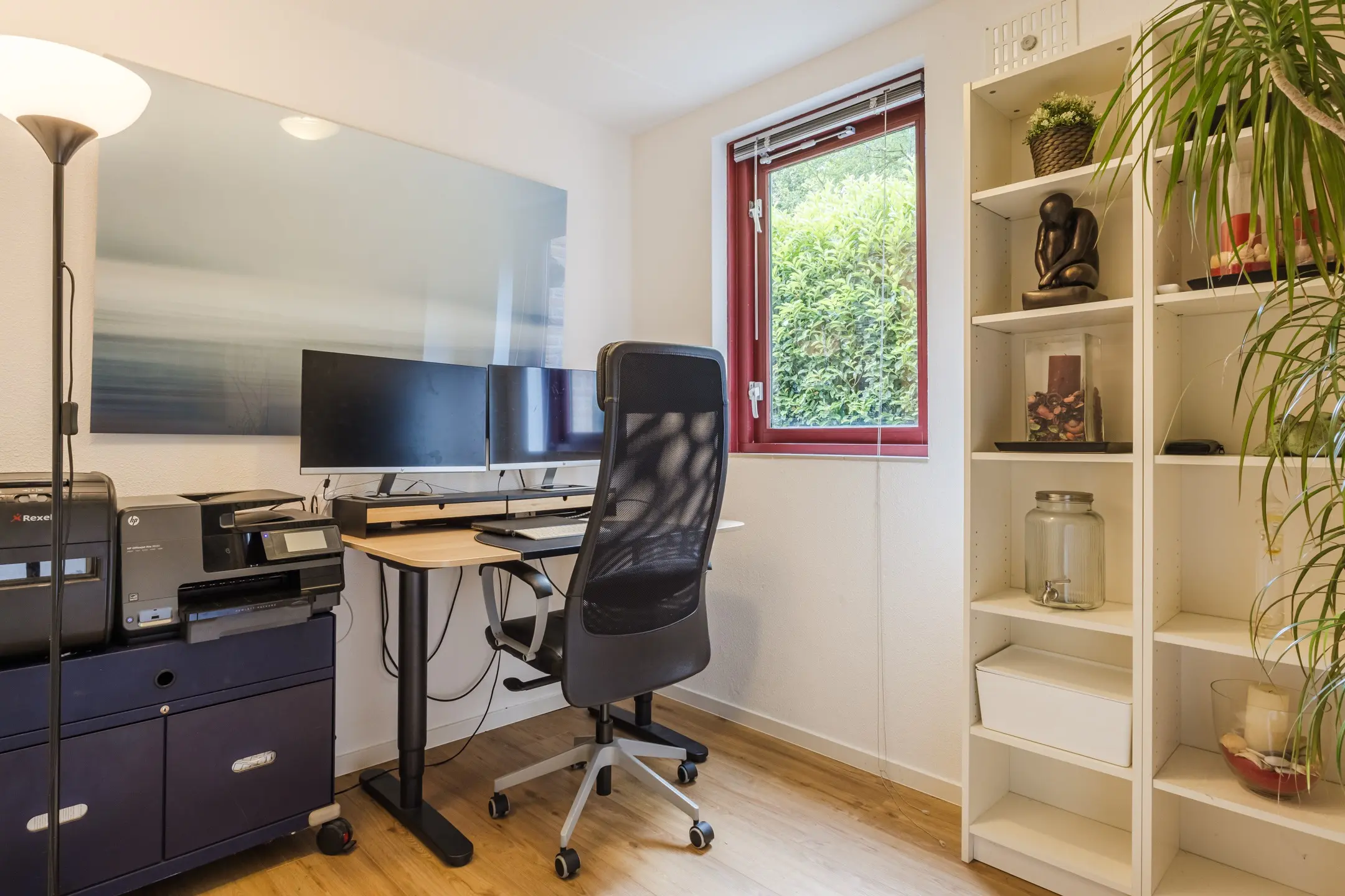 De begane grond biedt een lichte hal, bijkeuken met witgoedaansluitingen, een moderne badkamer met douche en wastafelmeubel, een separaat toilet en een trapkast voor extra bergruimte. De gehele benedenverdieping heeft een stijlvolle pvc-vloer, elektrische vloerverwarming en in de woonkamer een gezellige houtkachel. De halfopen keuken is voorzien van moderne inbouwapparatuur, zoals een inductiekookplaat en oven. Daarnaast is er een slaapkamer op de begane grond, momenteel ingericht als studieruimte.