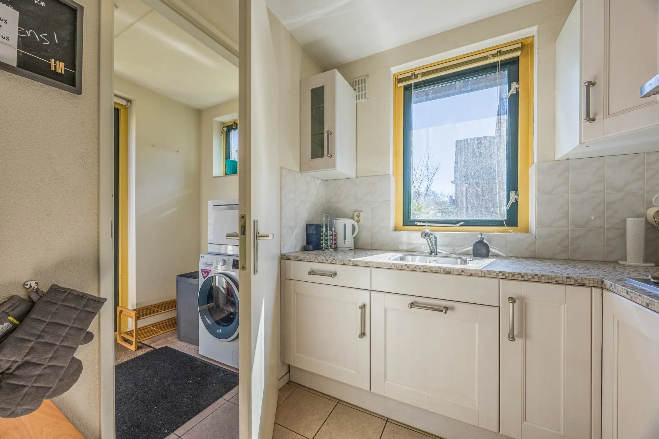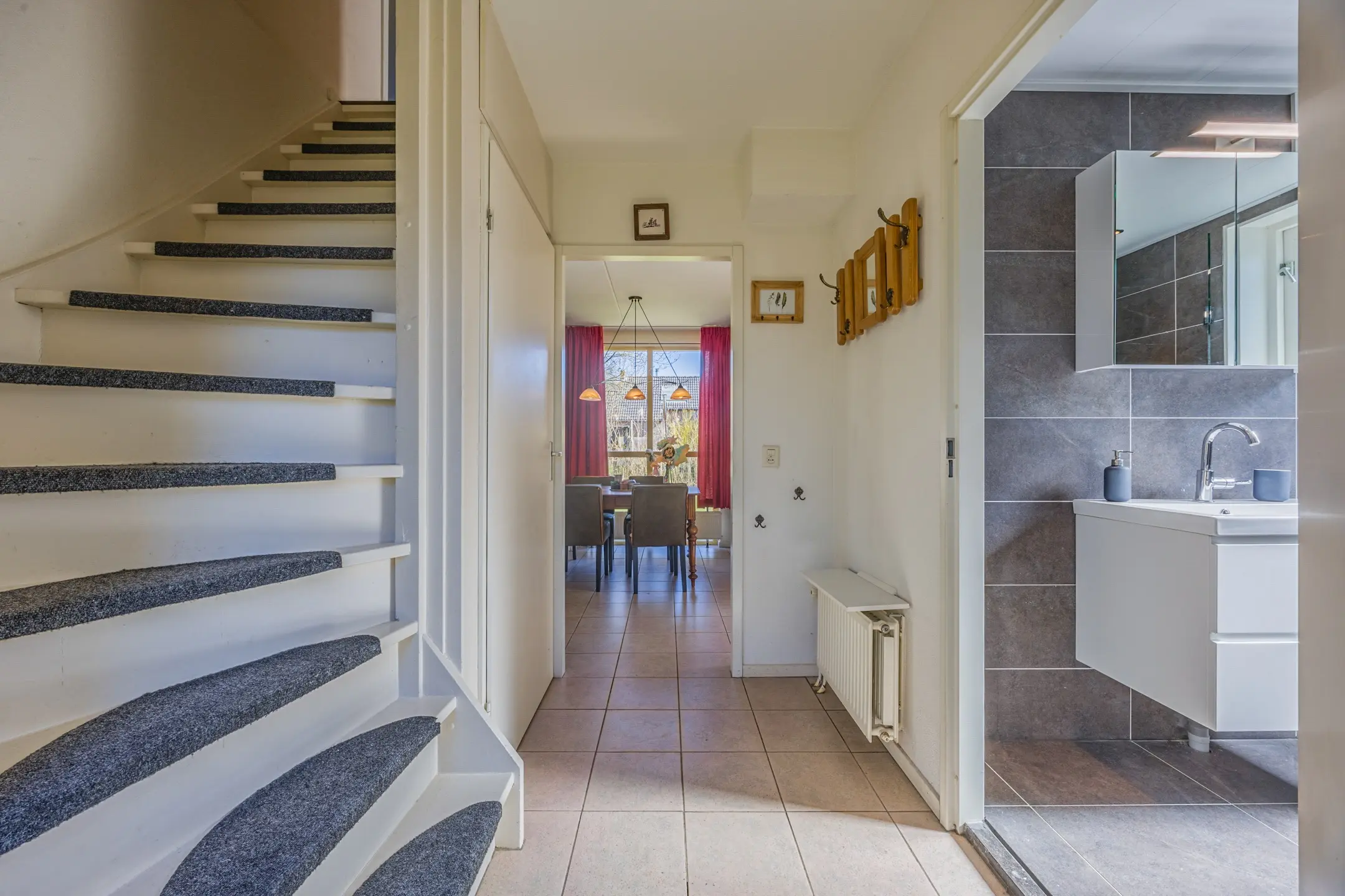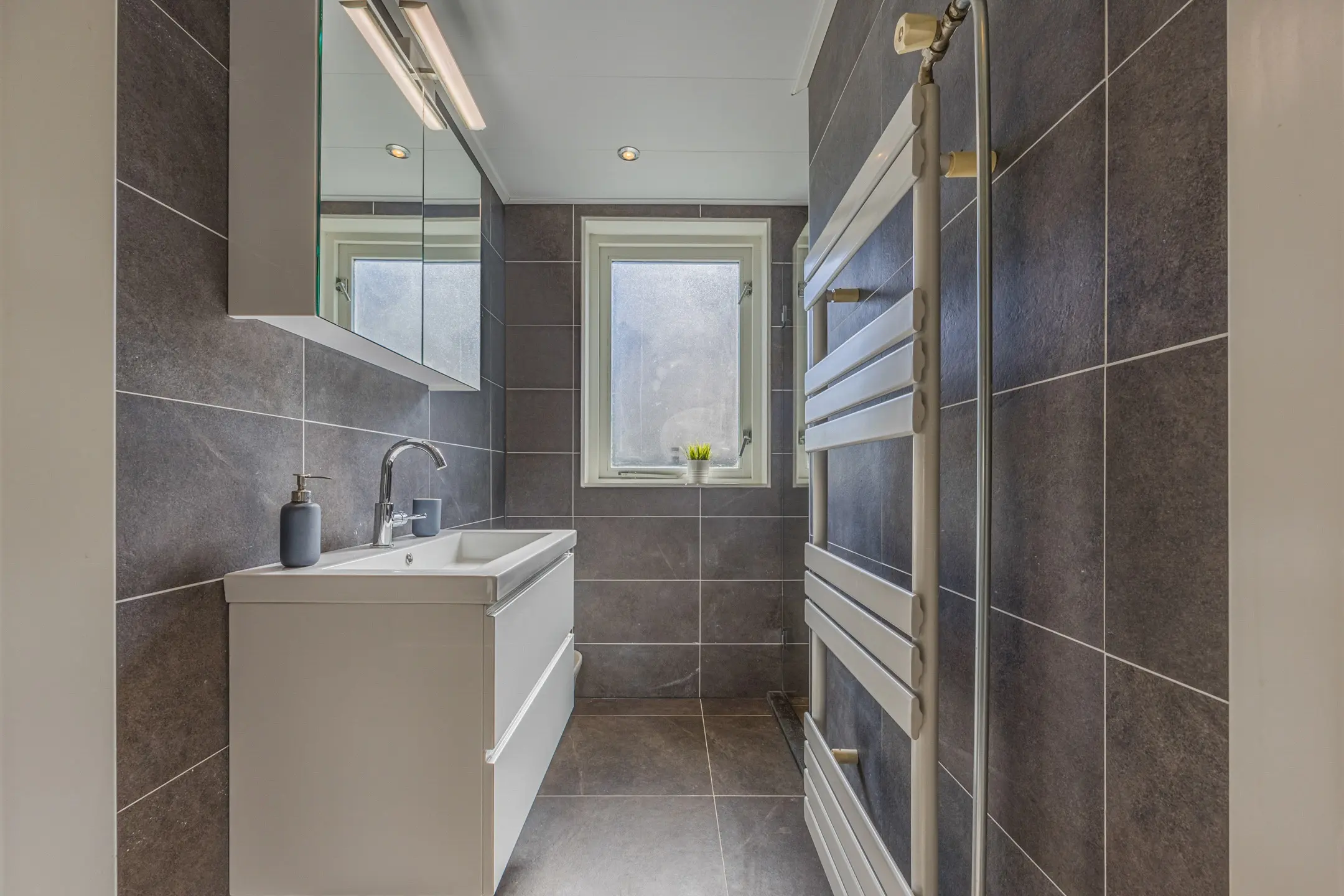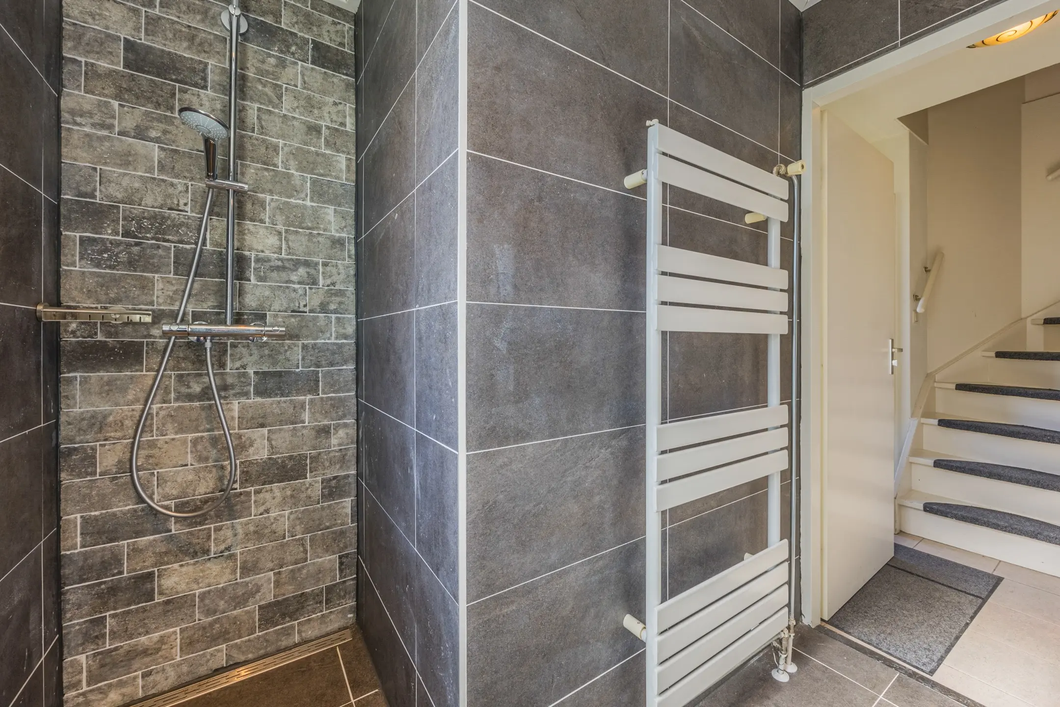 Entree, hal, meterkast, separaat toilet (hangend) met fonteintje, moderne badkamer met wastafelmeubel, designradiator en inloop(regen)douche, zeer ruime woonkamer met openslaande deuren naar de achtertuin, nette keuken welke is voorzien van inbouwapparatuur, bijkeuken en slaapkamer I aan de voorzijde.