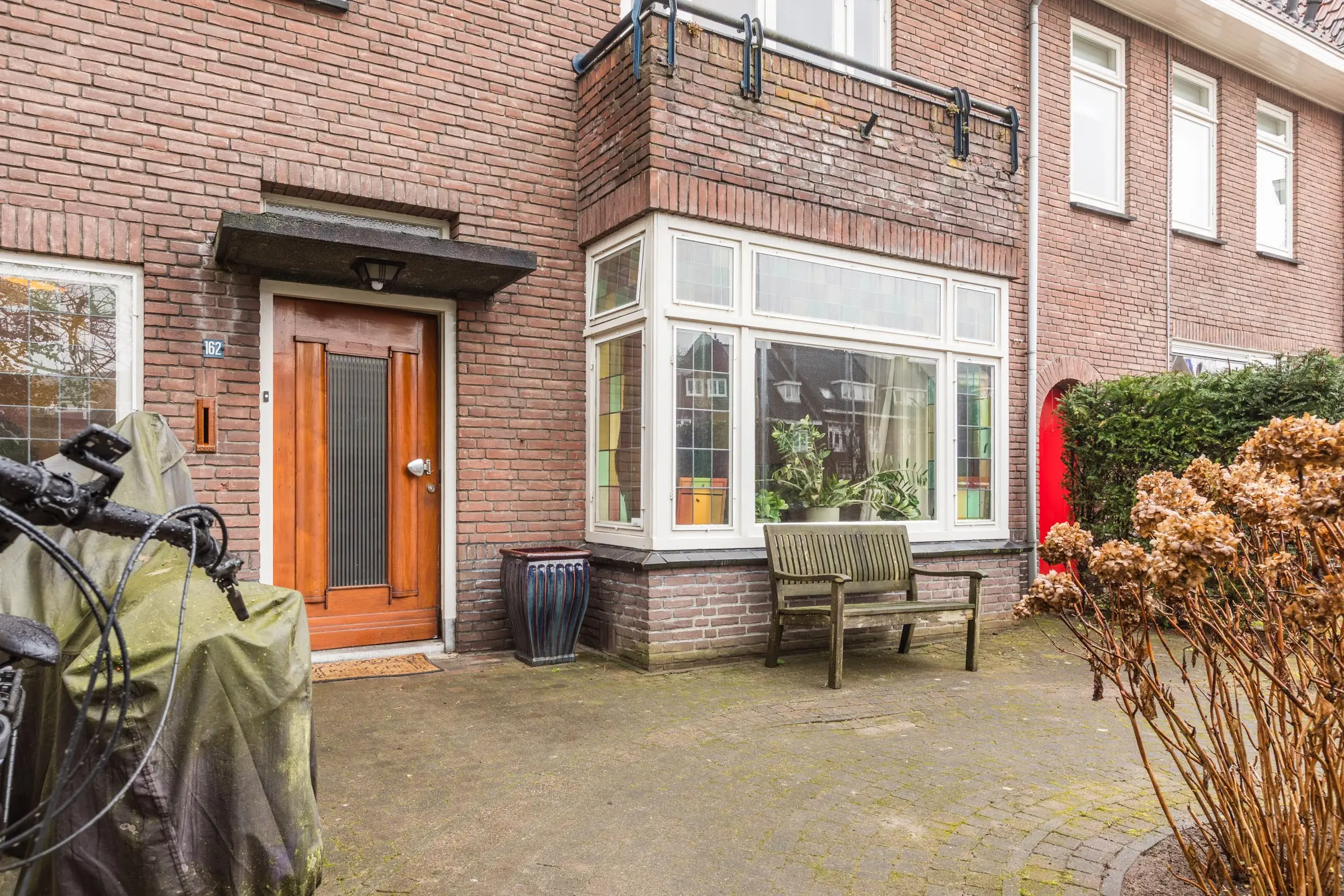 Aan de voorzijde zit een trap naar de voortuin.