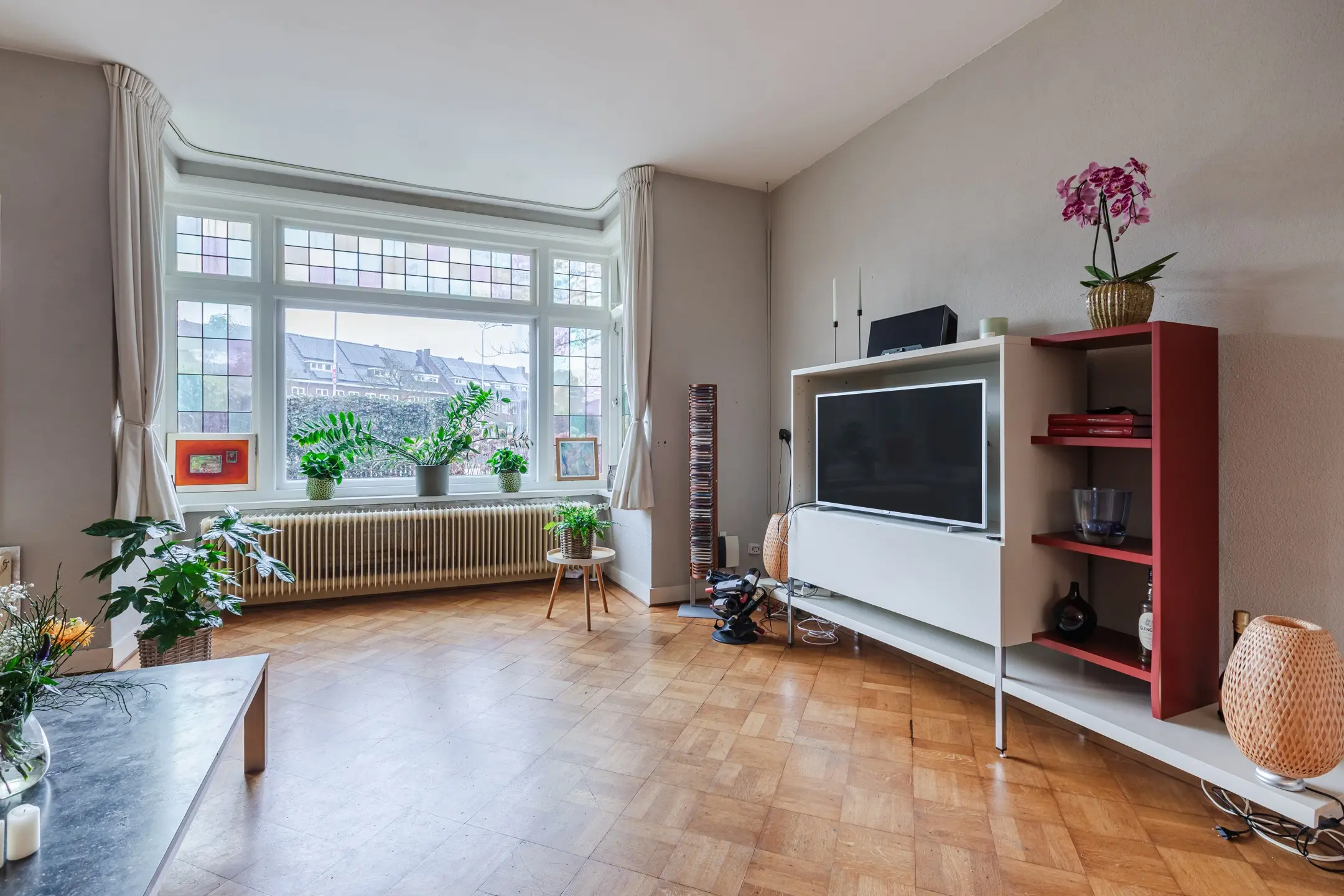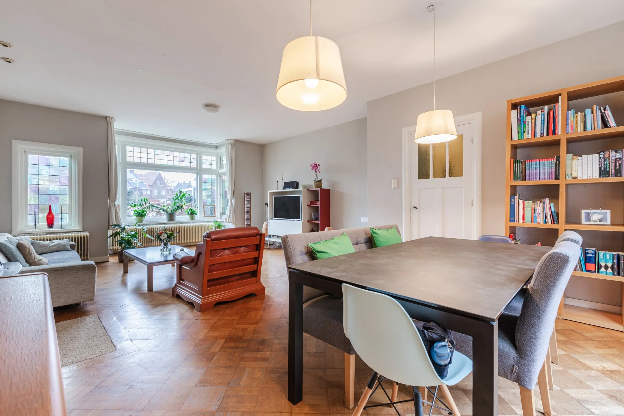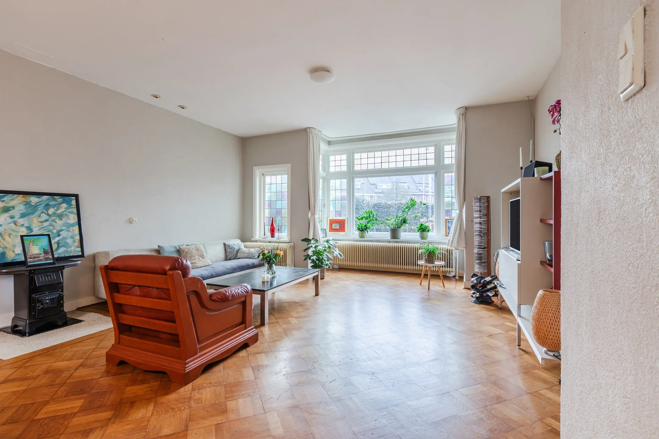 De lichte woonkamer beschikt eveneens over openslaande tuindeuren naar de achtertuin en wordt aan de voorzijde verrijkt door een royale erker, die zorgt voor extra ruimte en een prettige lichtinval.