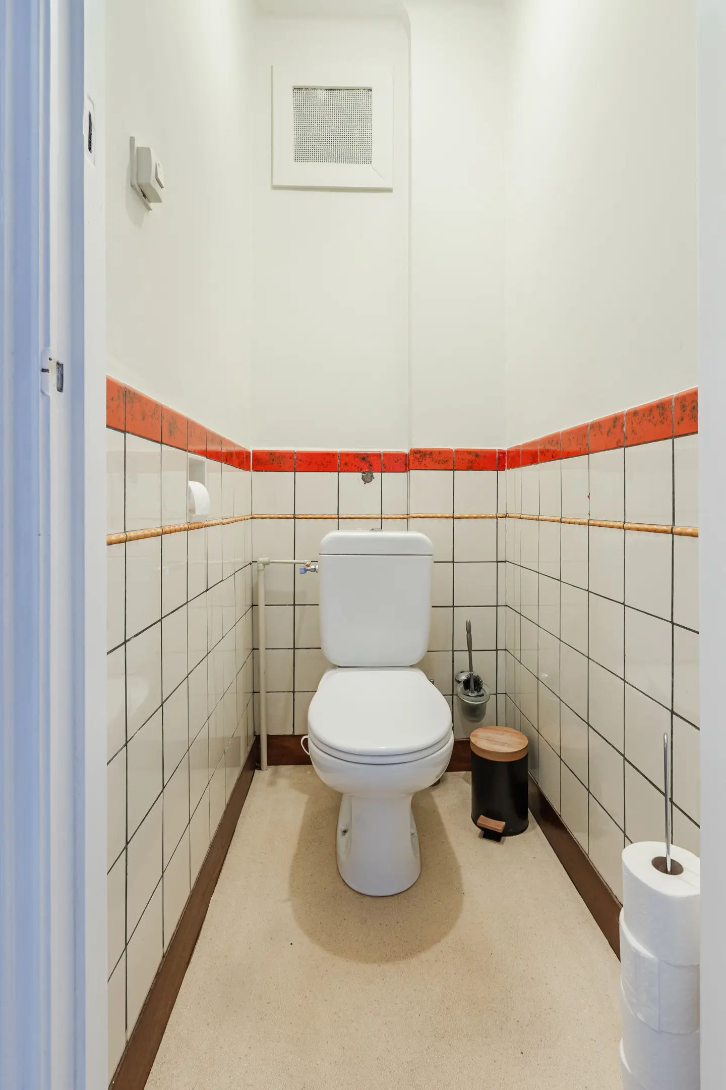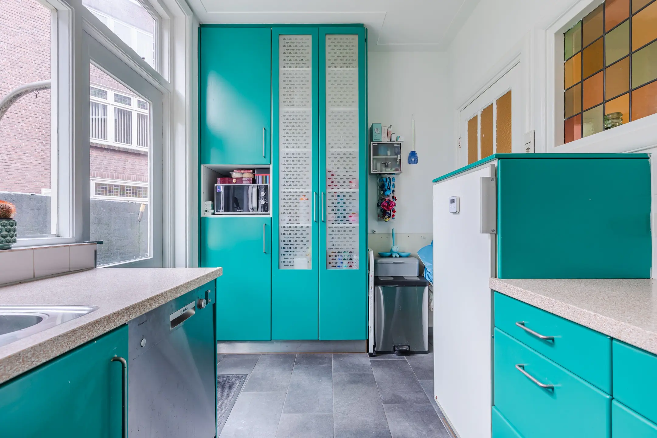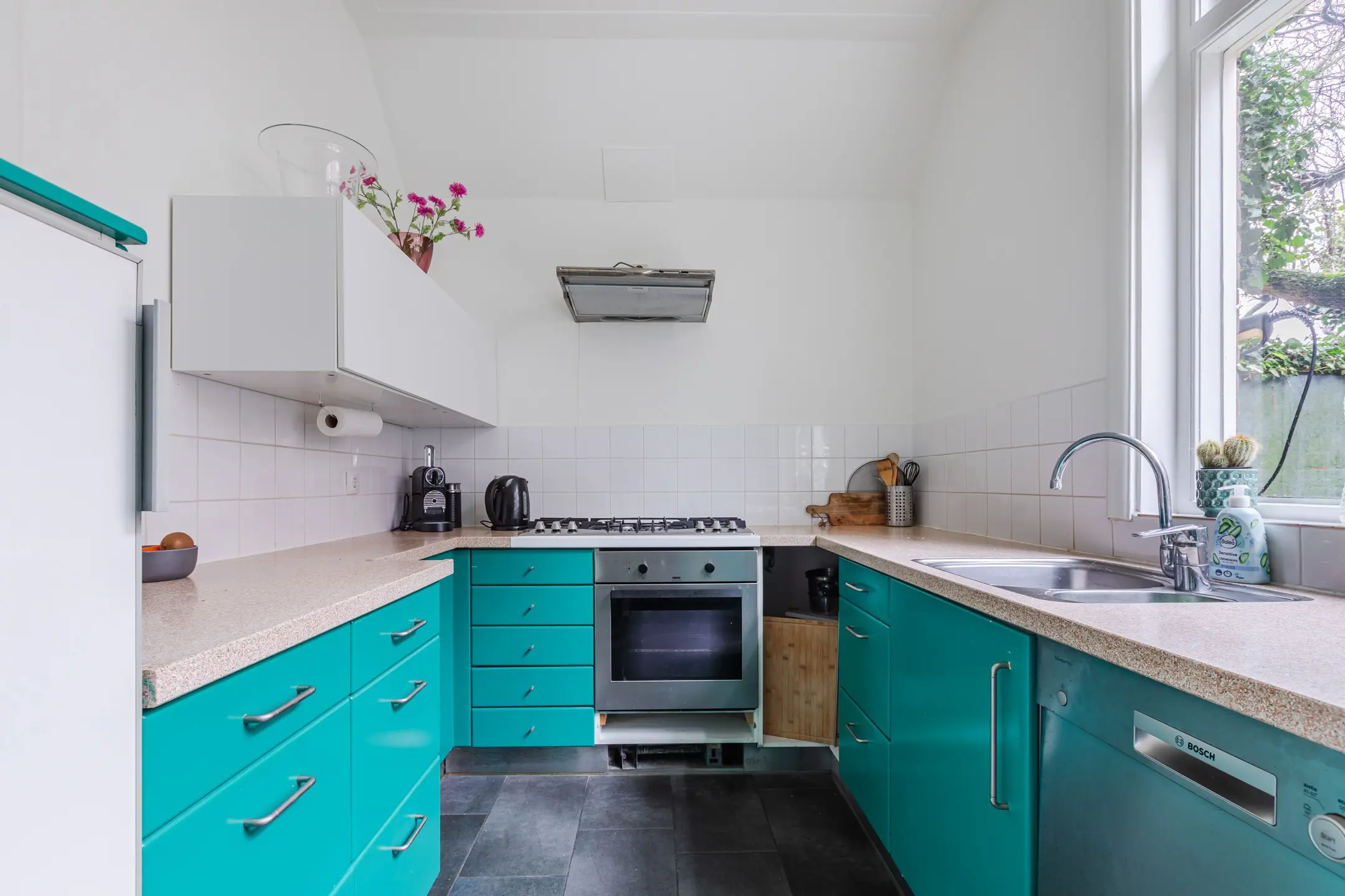 In de hal bevinden zich de toiletruimte en de keuken, uitgevoerd in een U-opstelling en voorzien van een deur naar de achtertuin.