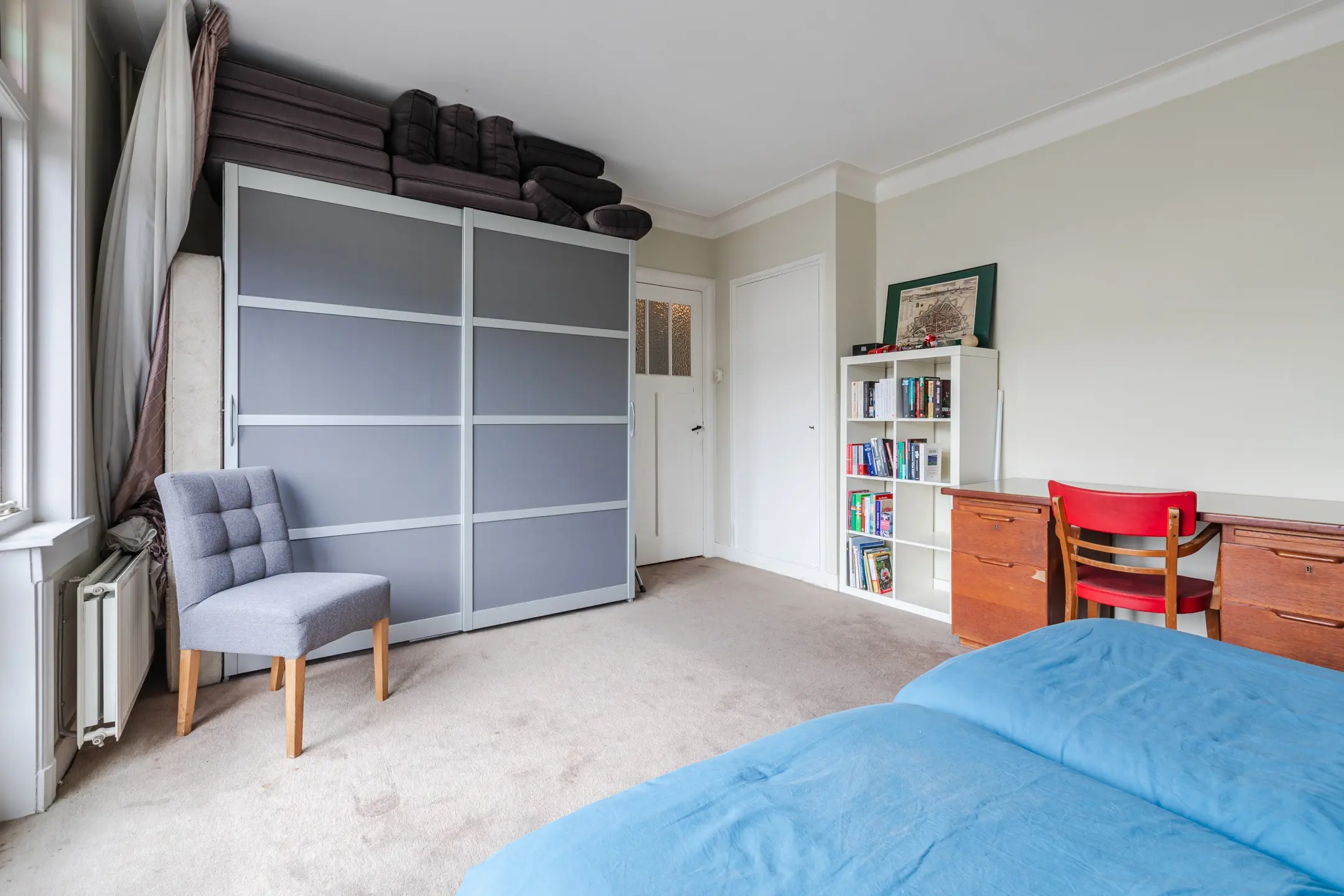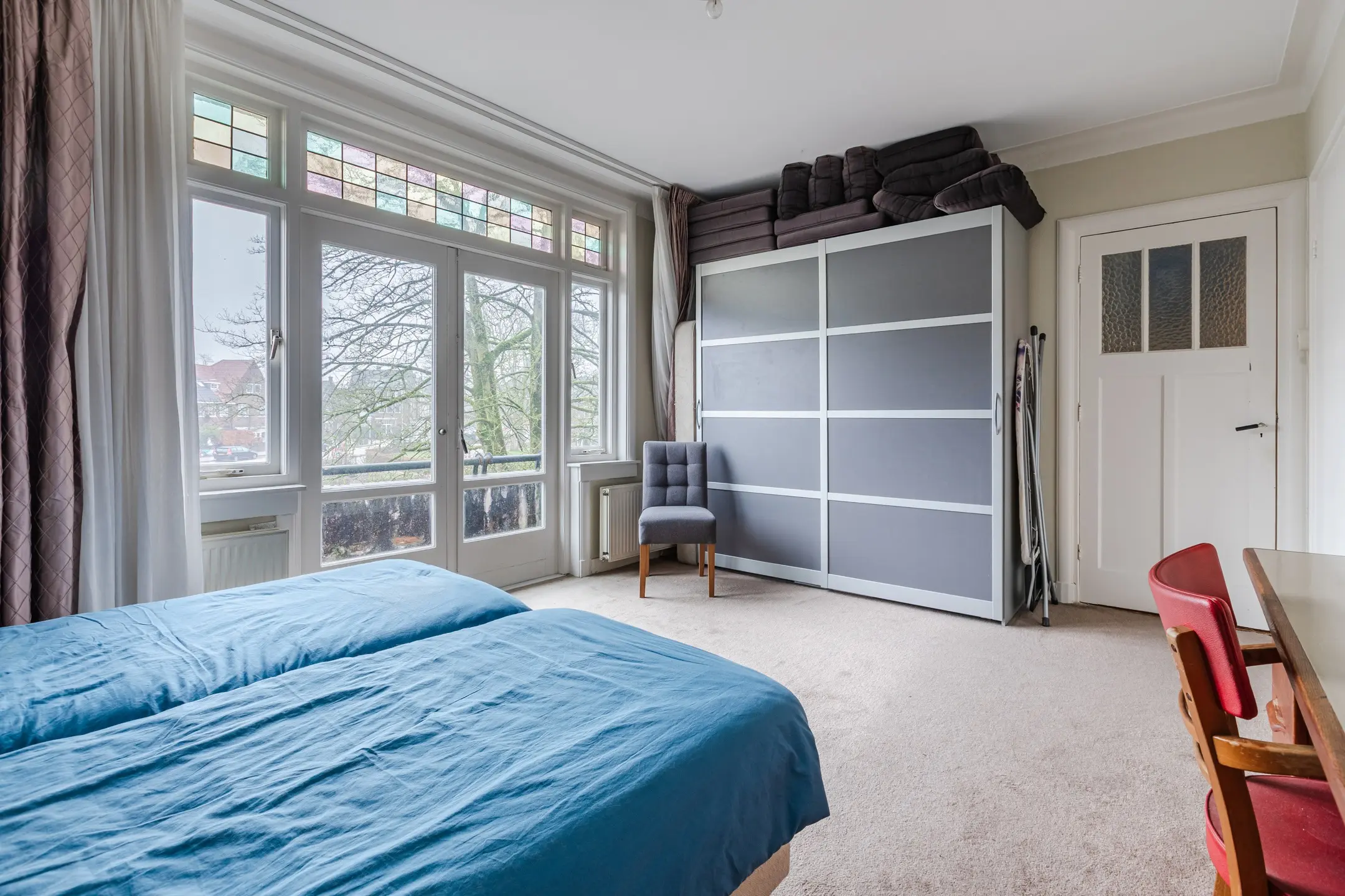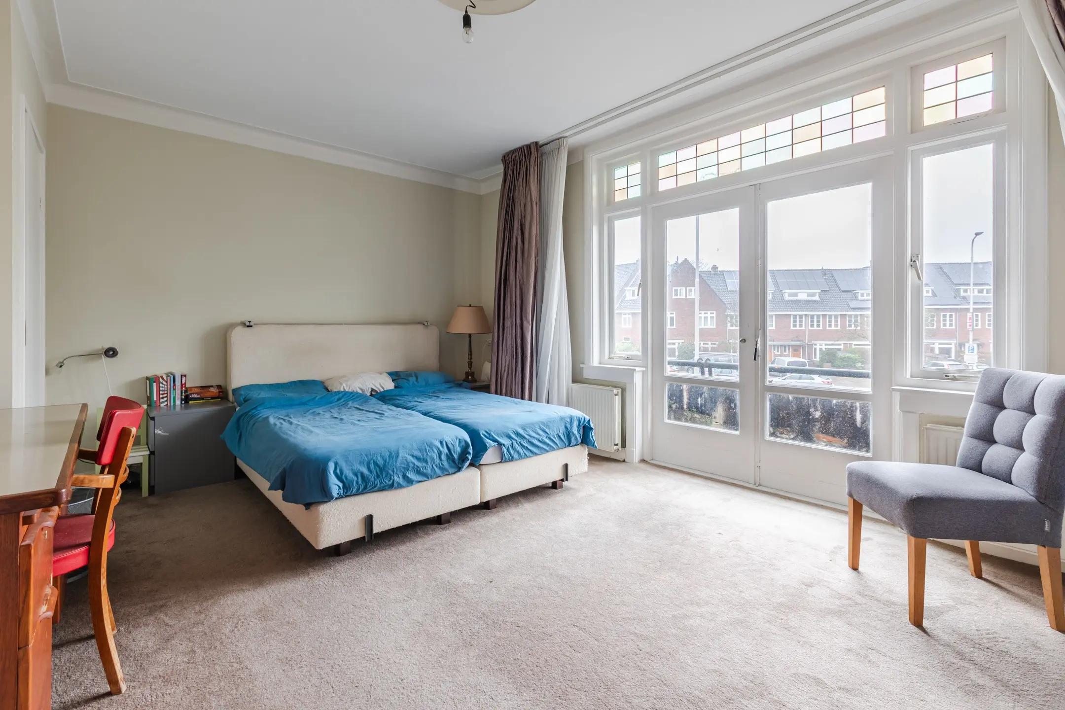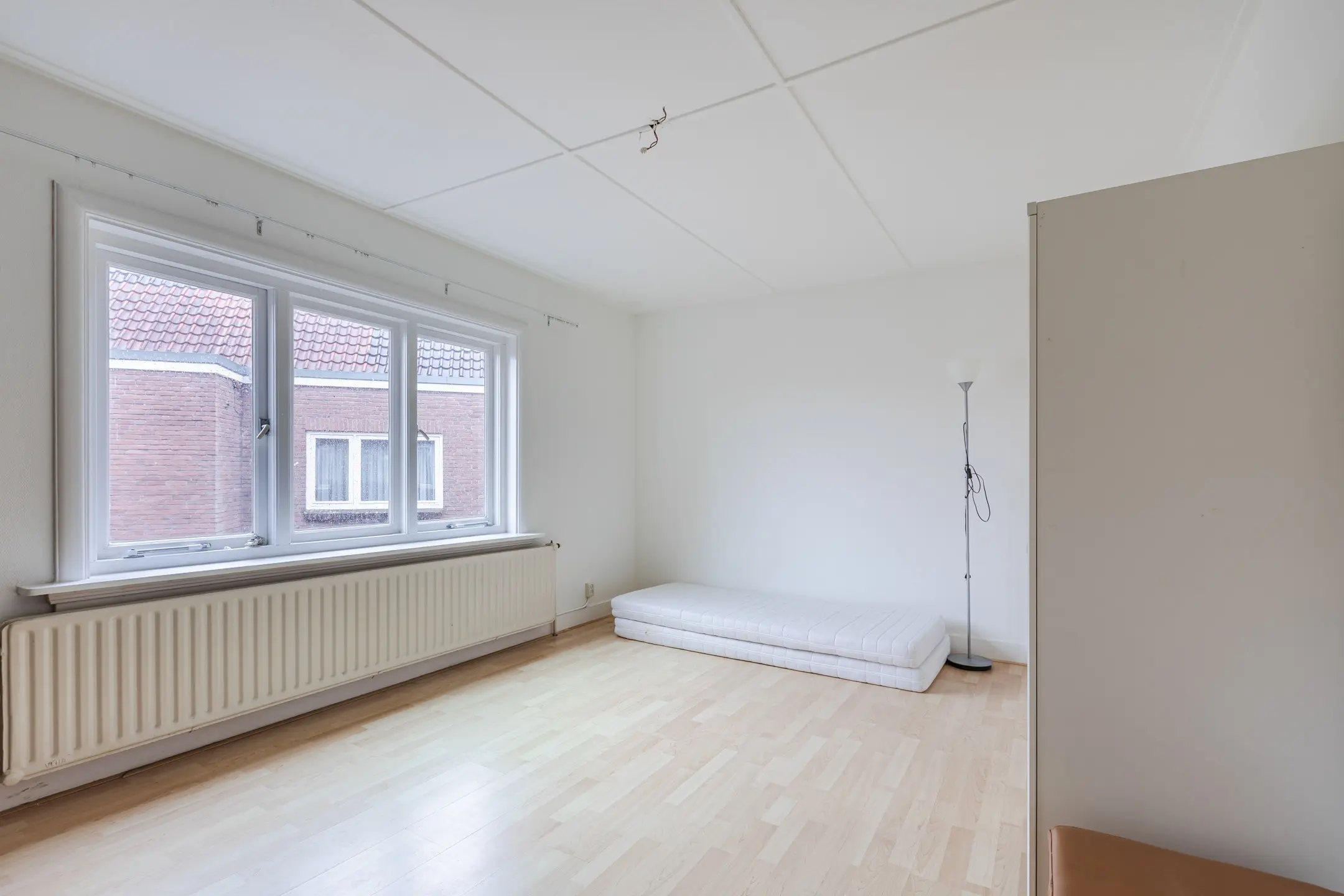 De grootste slaapkamer aan de voorzijde heeft een balkon en vaste kasten.