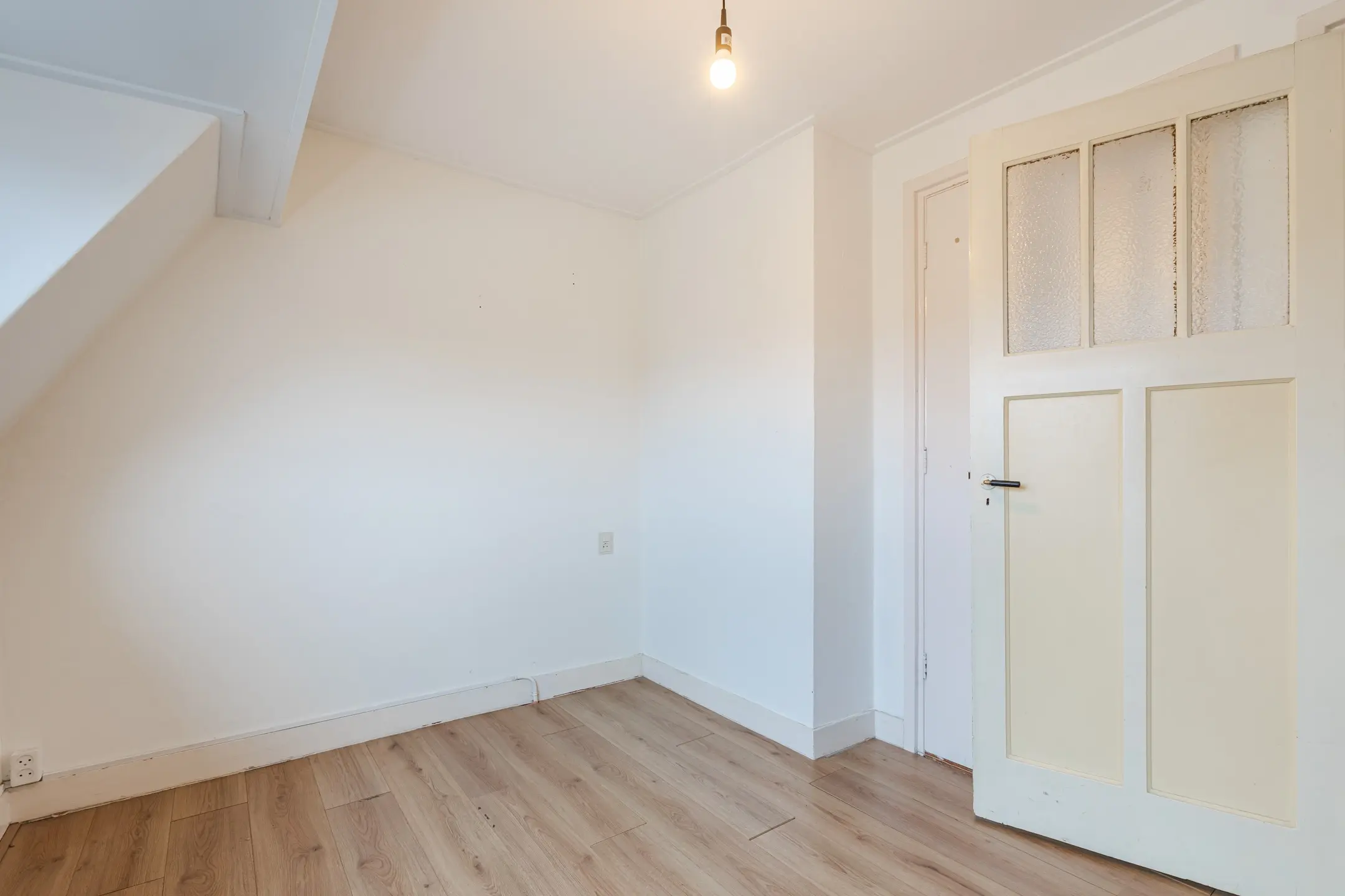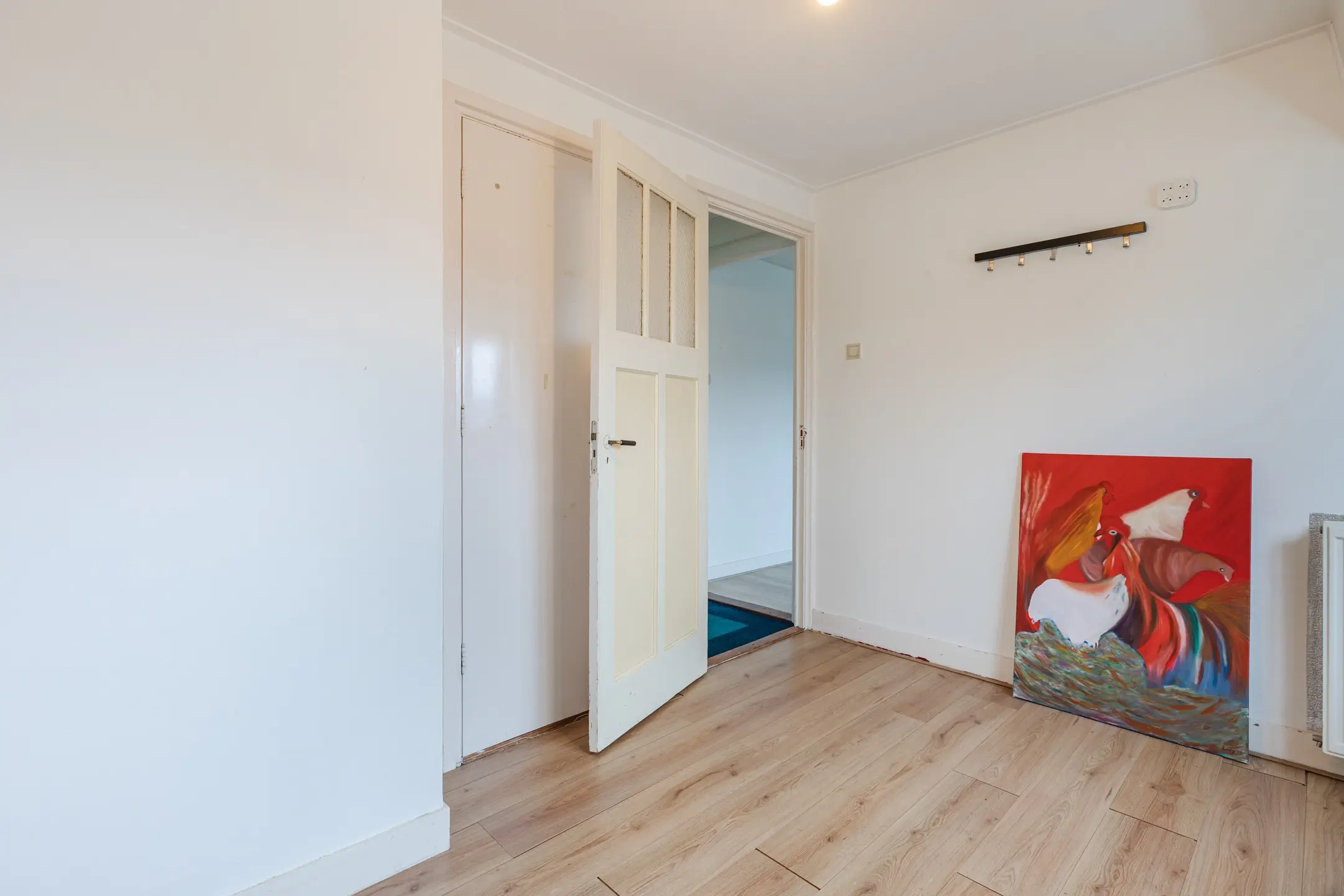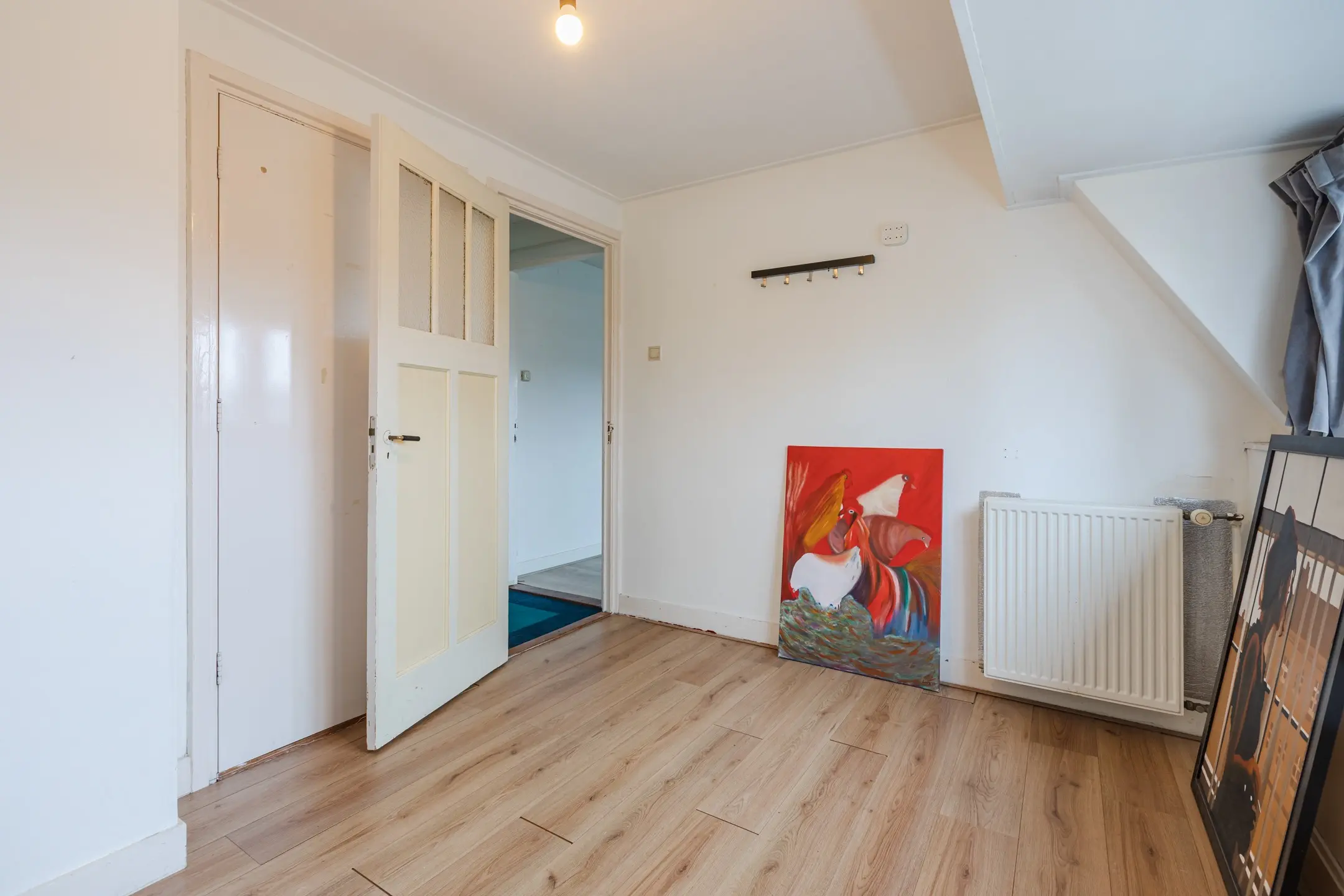 Overloop met afsluitbare deur (met luik naar de 3e verdieping) vervolgens (woon)kamer en 2 slaapkamers waarvan 1 kamer een vaste kast heeft.