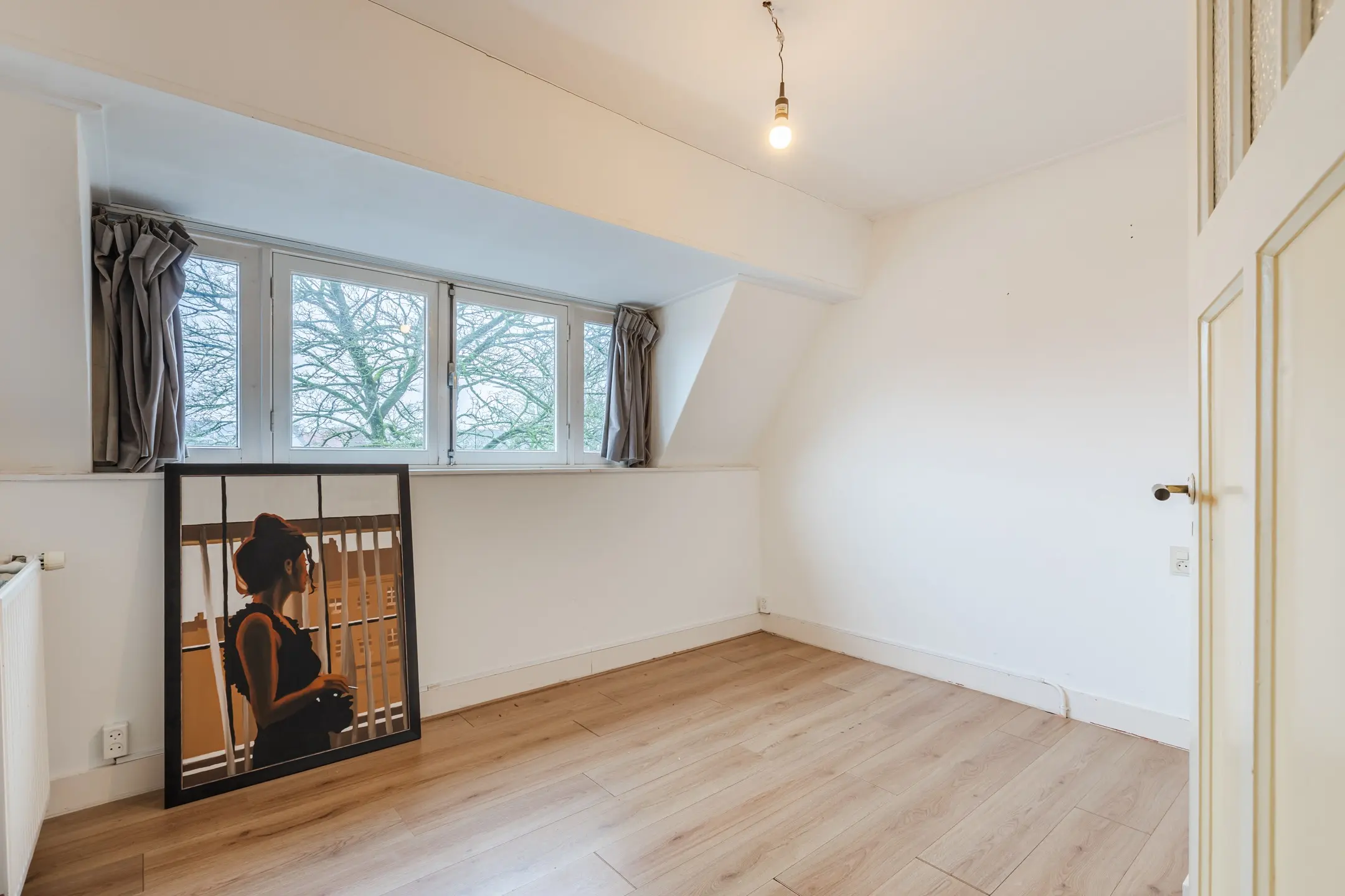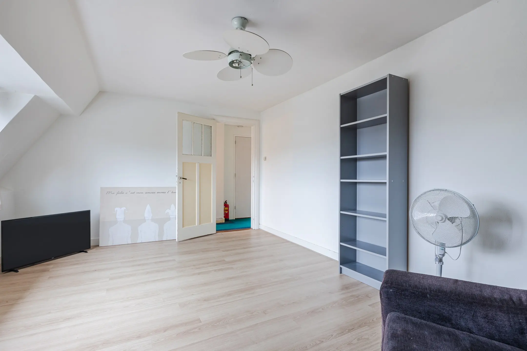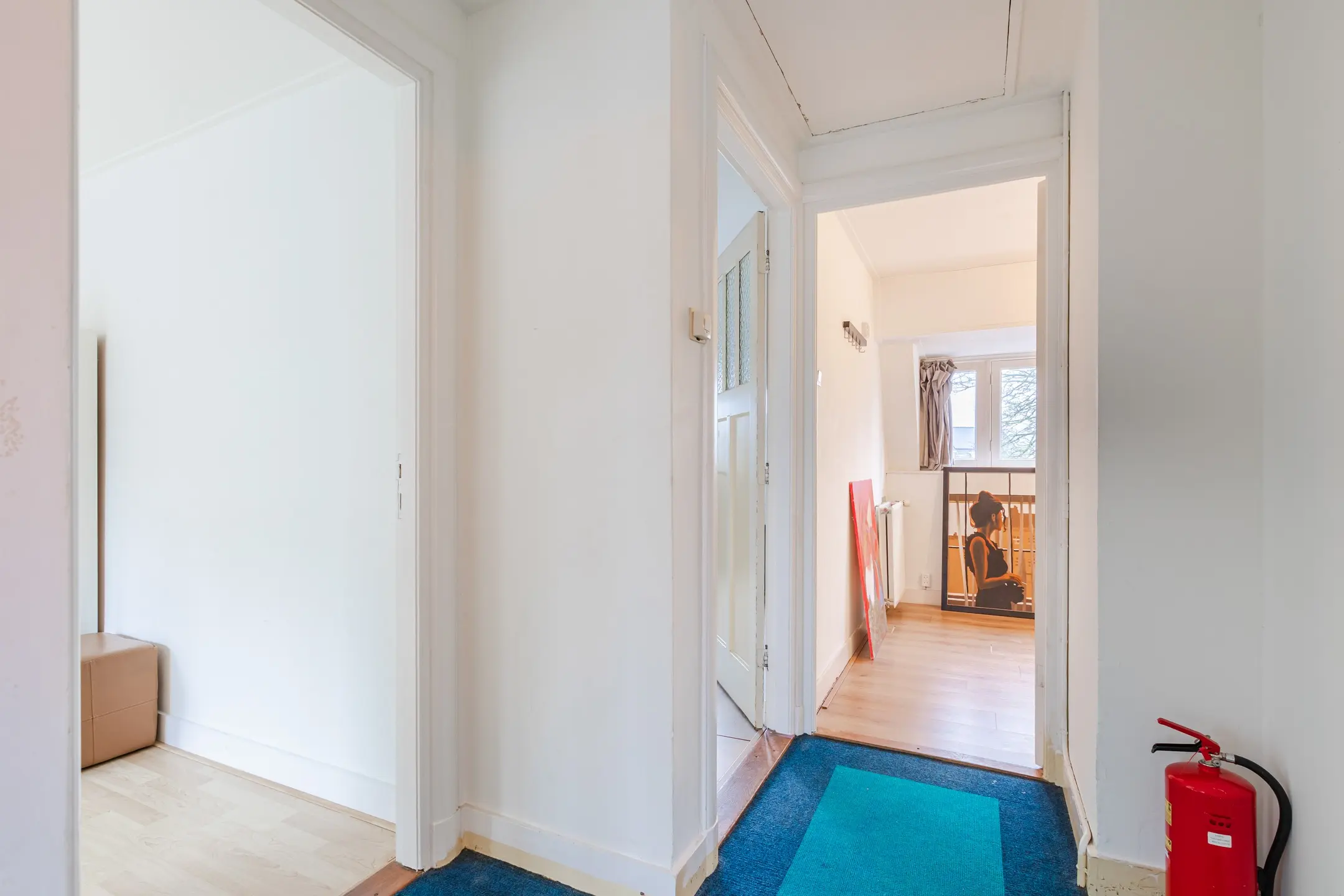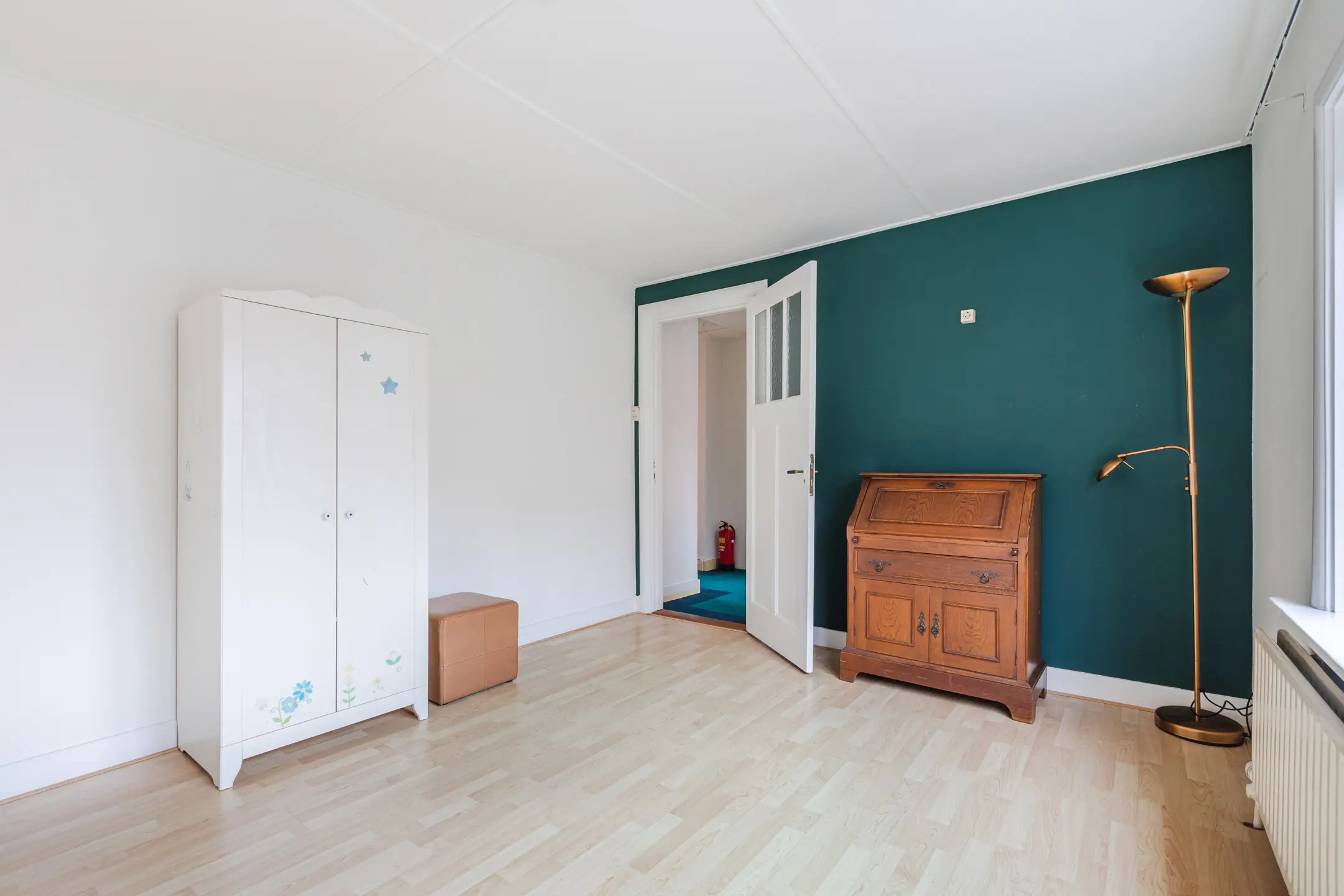 Overloop met afsluitbare deur (met luik naar de 3e verdieping) vervolgens (woon)kamer en 2 slaapkamers waarvan 1 kamer een vaste kast heeft.