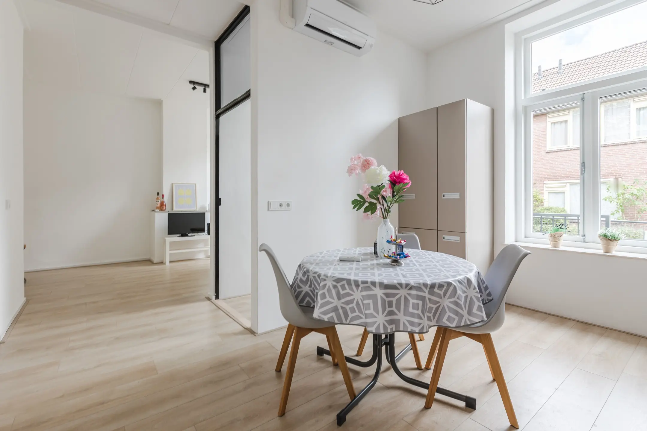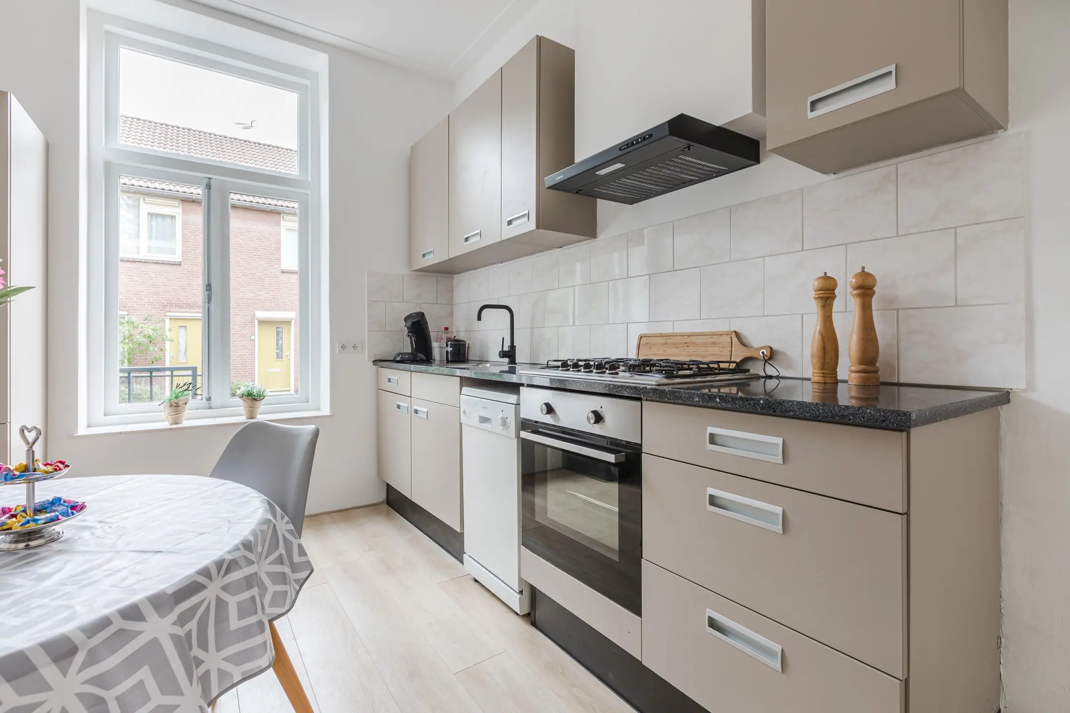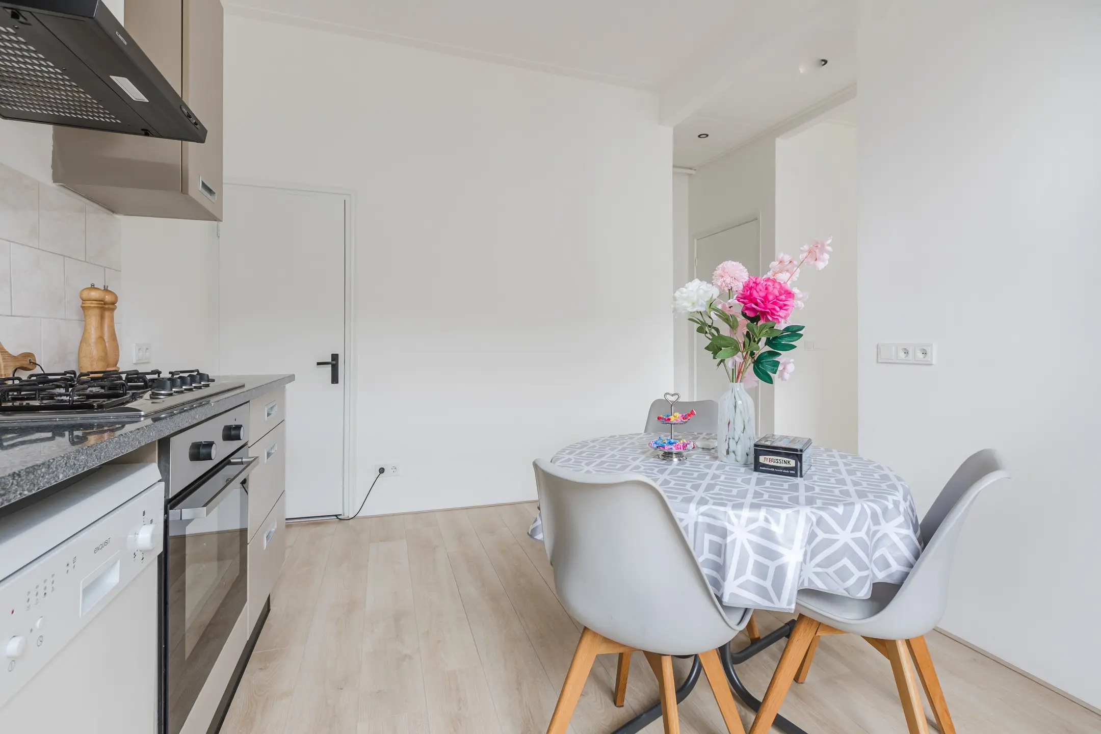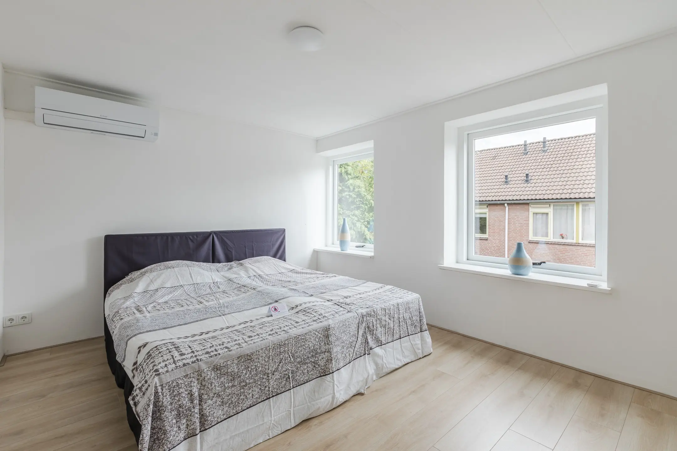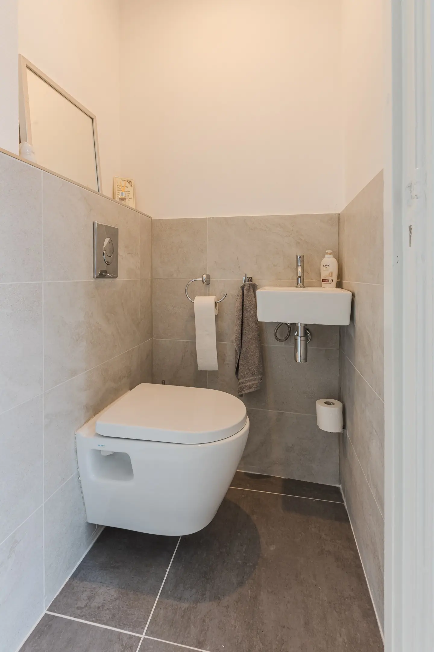 Entree, gang, ruime woonkamer met warmtepomp modern separaat toilet (hangend) met fonteintje, trappenkast, (woon)keuken met voldoende ruimte en inbouwapparatuur. Zowel de (woon)keuken als de woonkamer zijn voorzien van een airconditioner met geavanceerde inverter warmtepomp.
