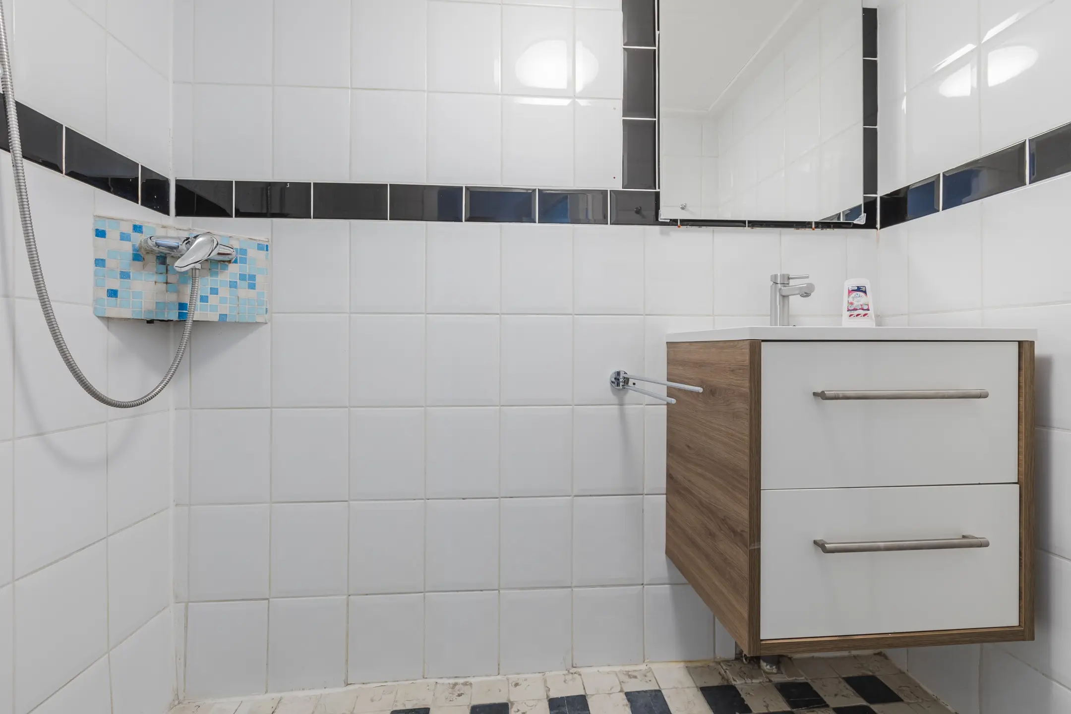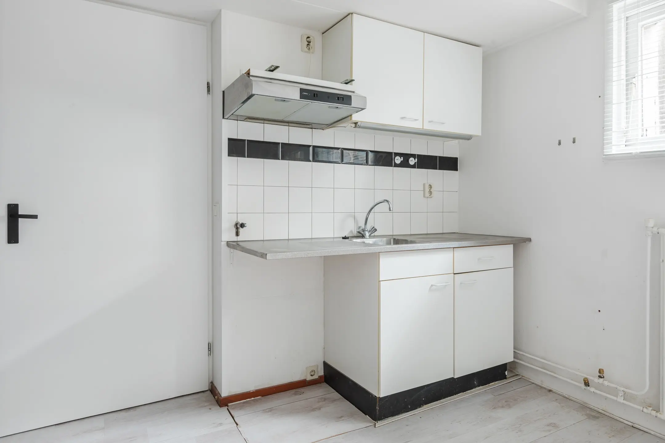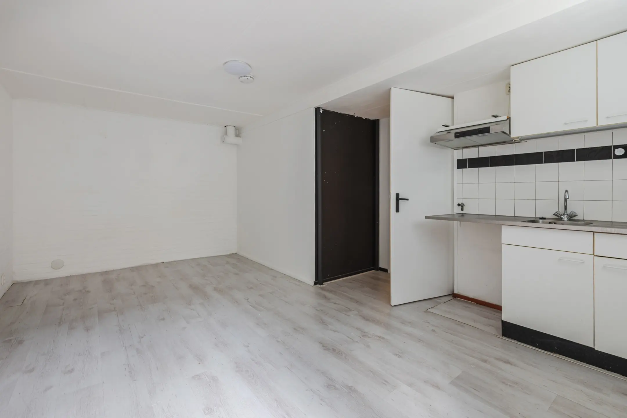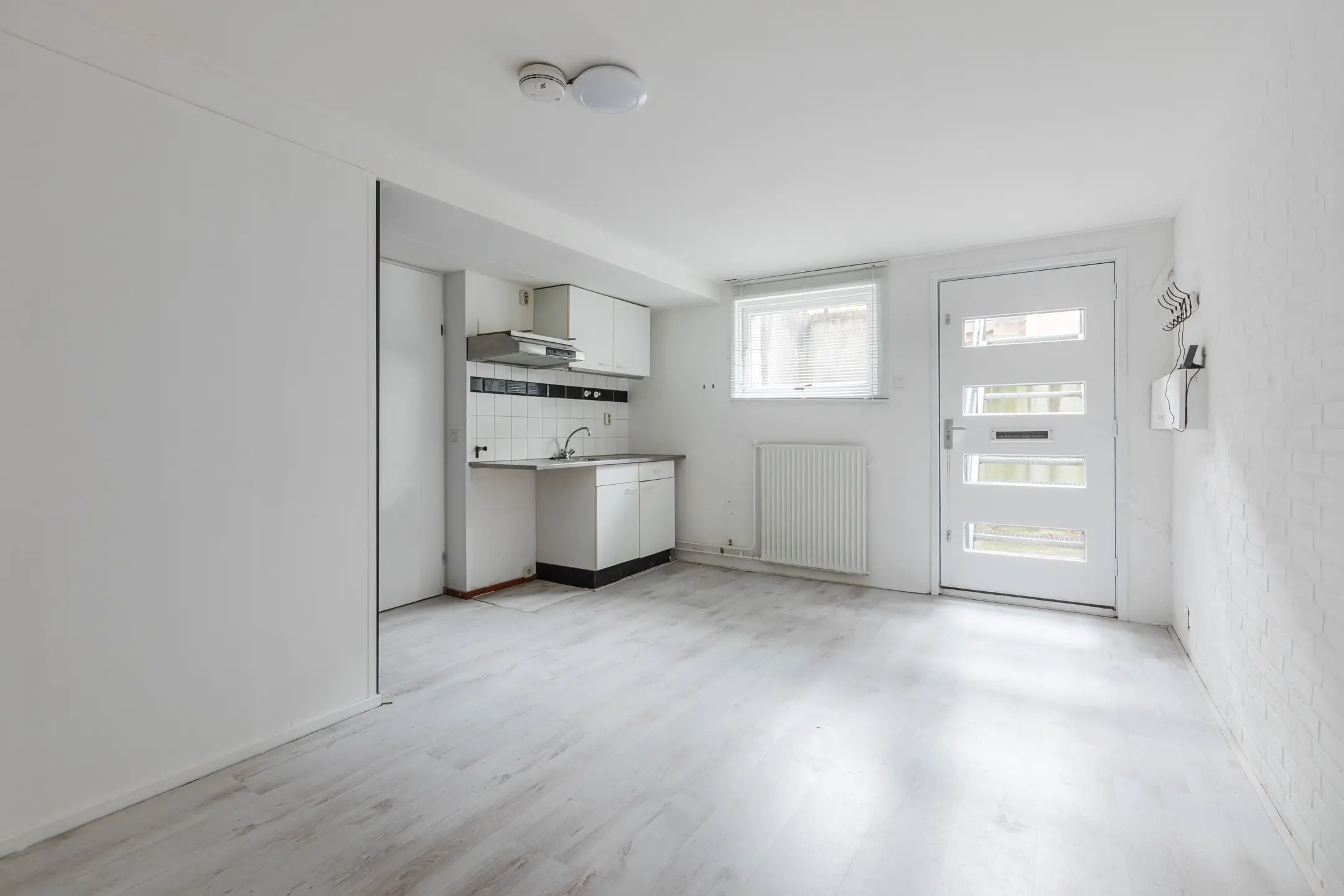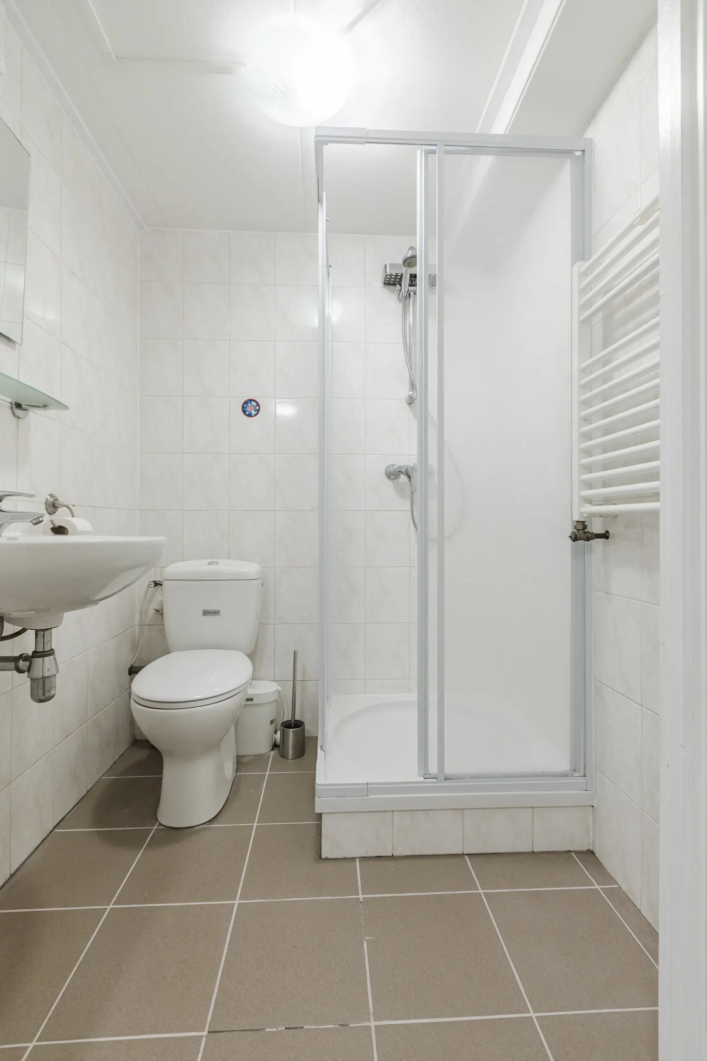 Eigen entree, woonkamer met keuken, slaapkamer, stookruimte, badkamer met wastafel, douche en toilet.