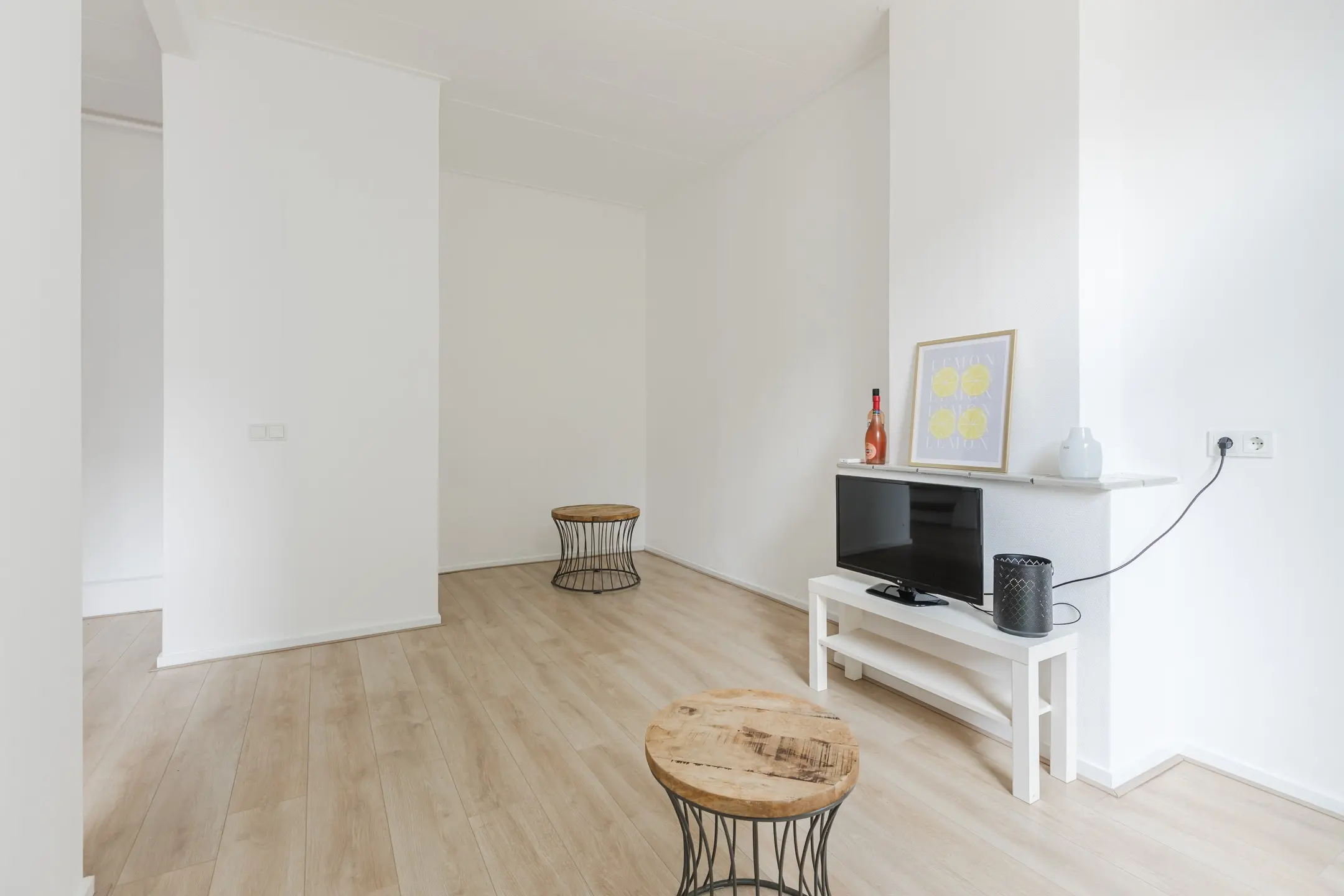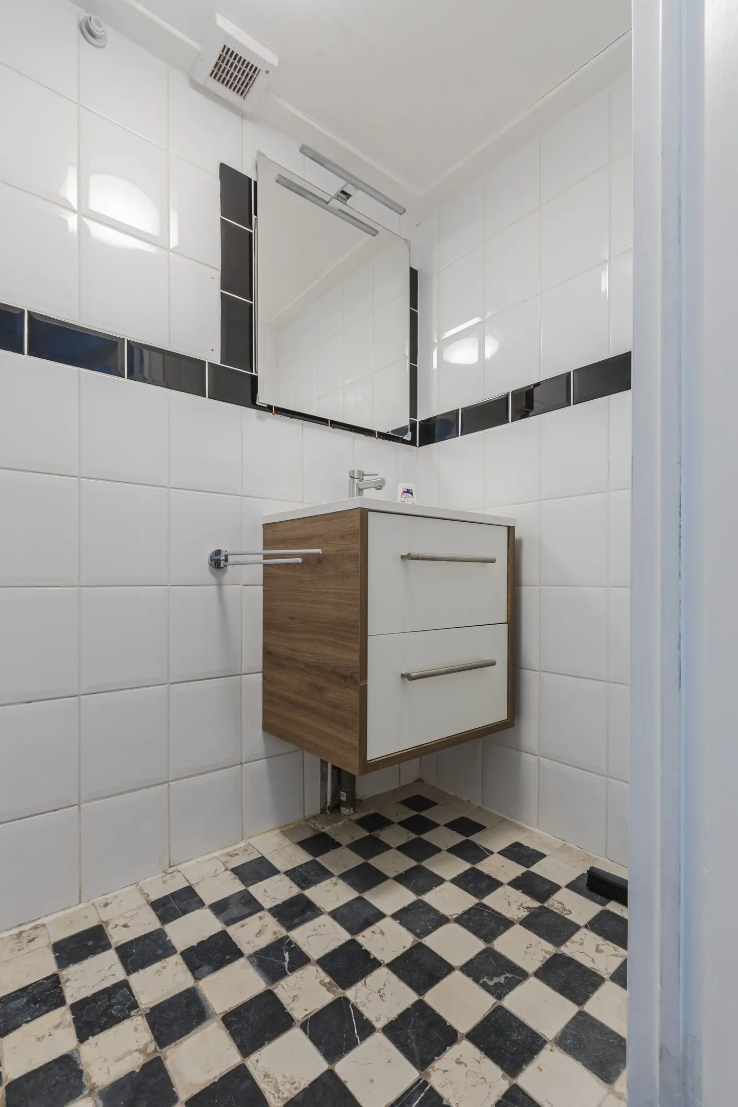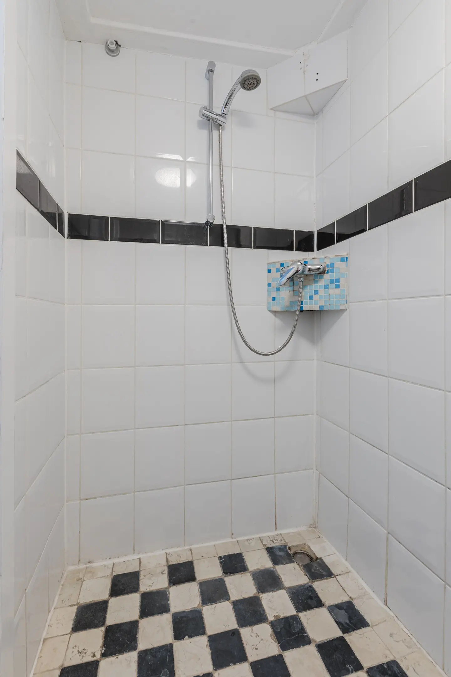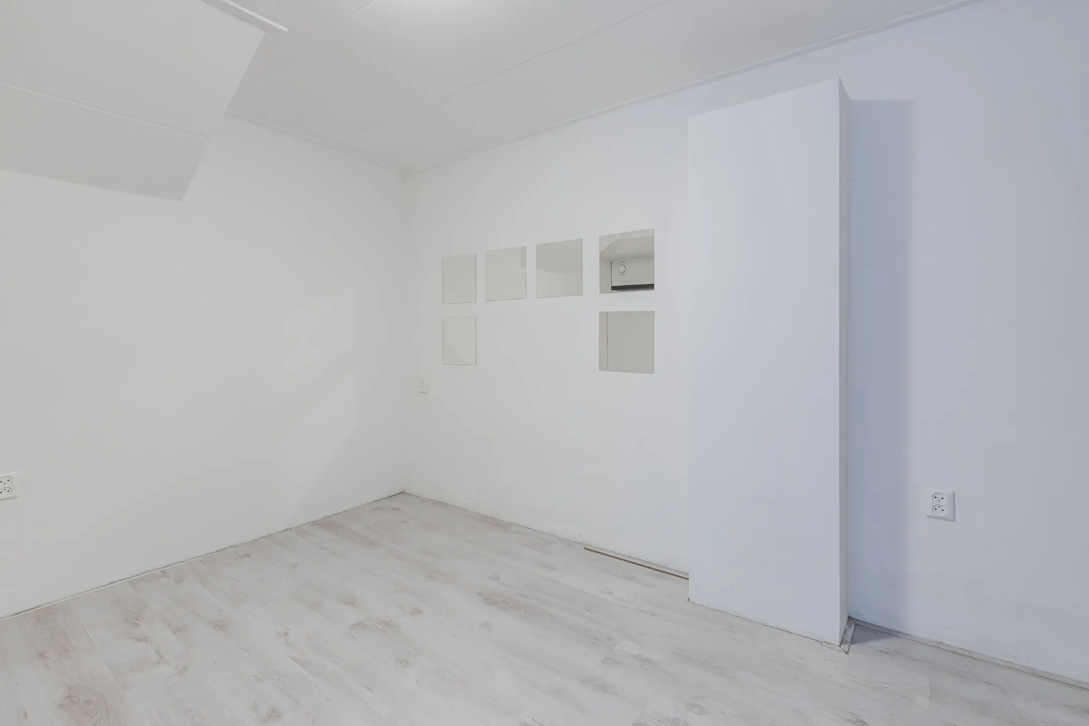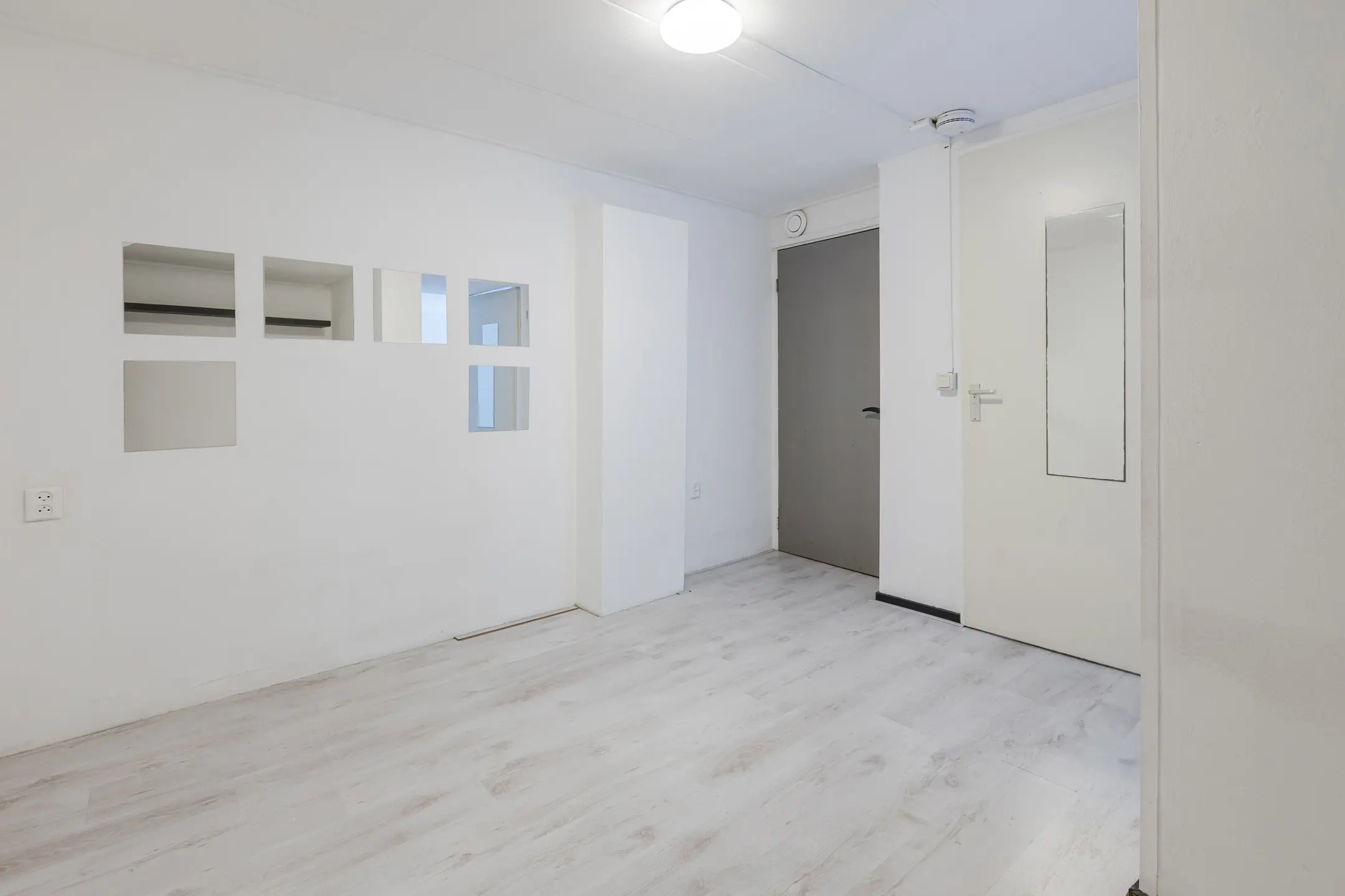 Eigen entree, woonkamer met keuken, slaapkamer, stookruimte, badkamer met wastafel, douche en toilet.