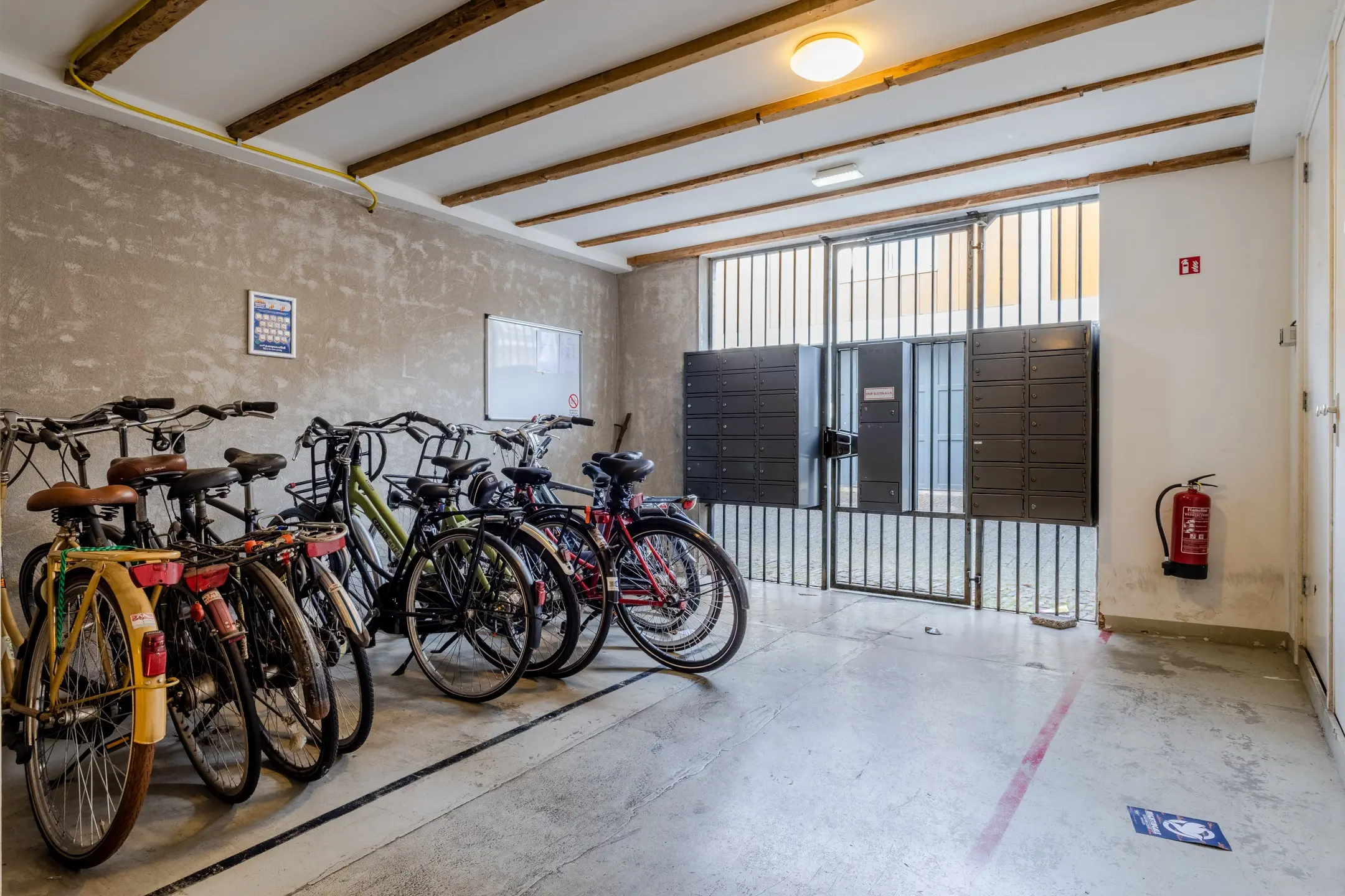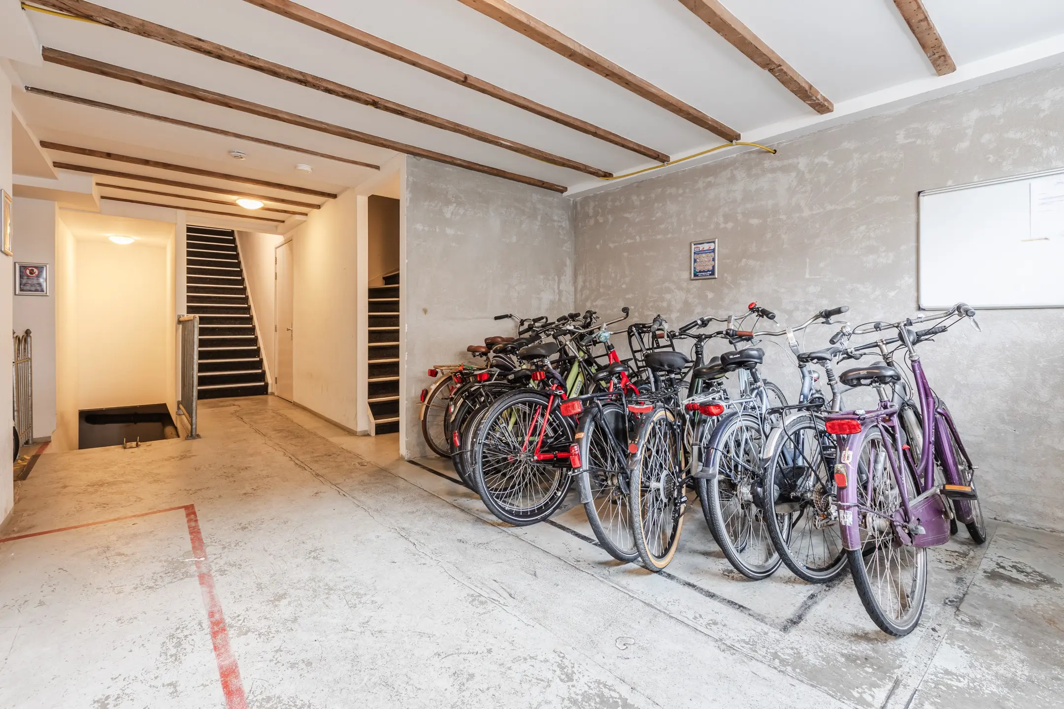 Trapopgang naar de algemene daktuin en het souterrain met gemeenschappelijke fietsenstalling en eigen berging.