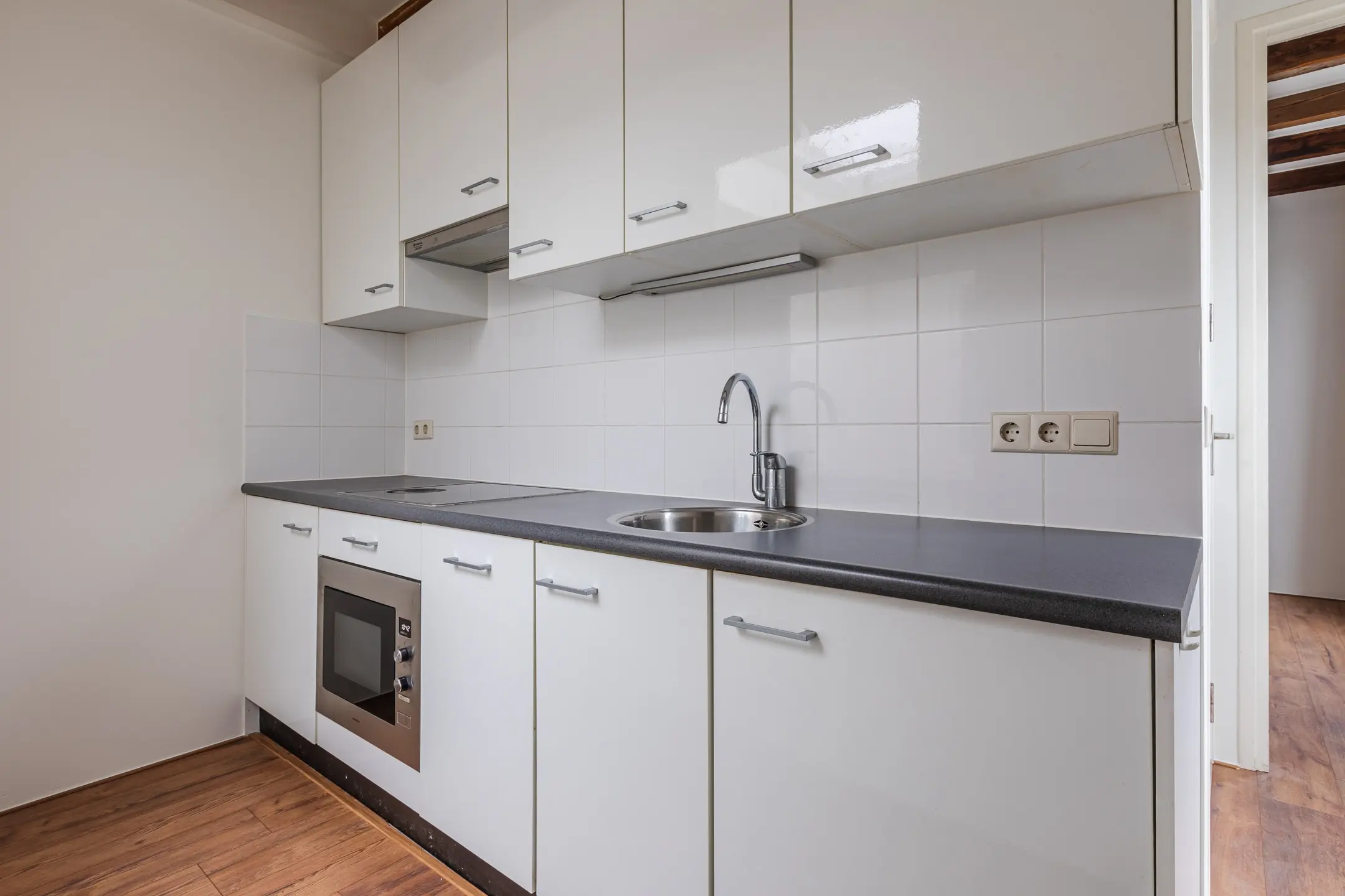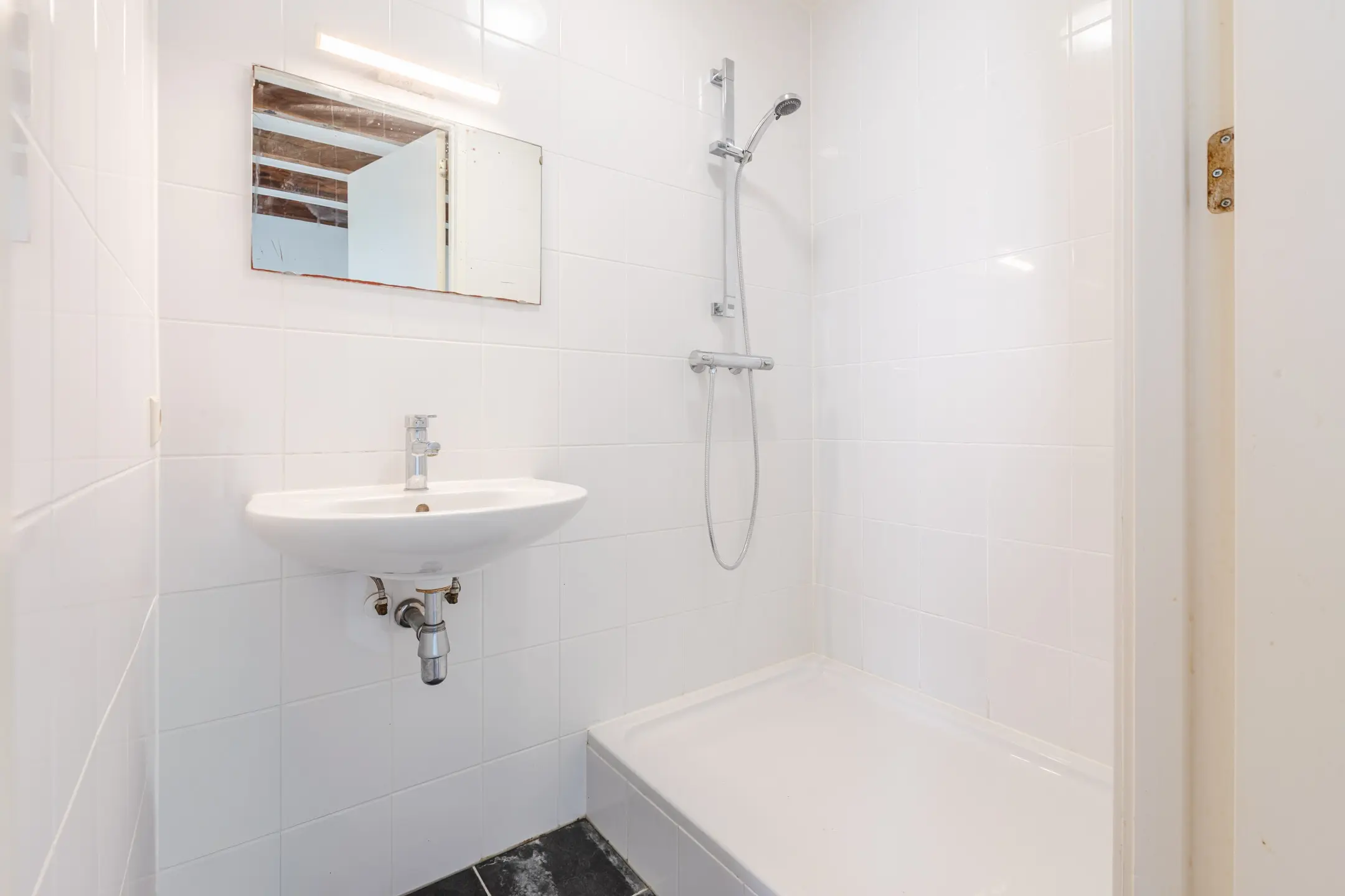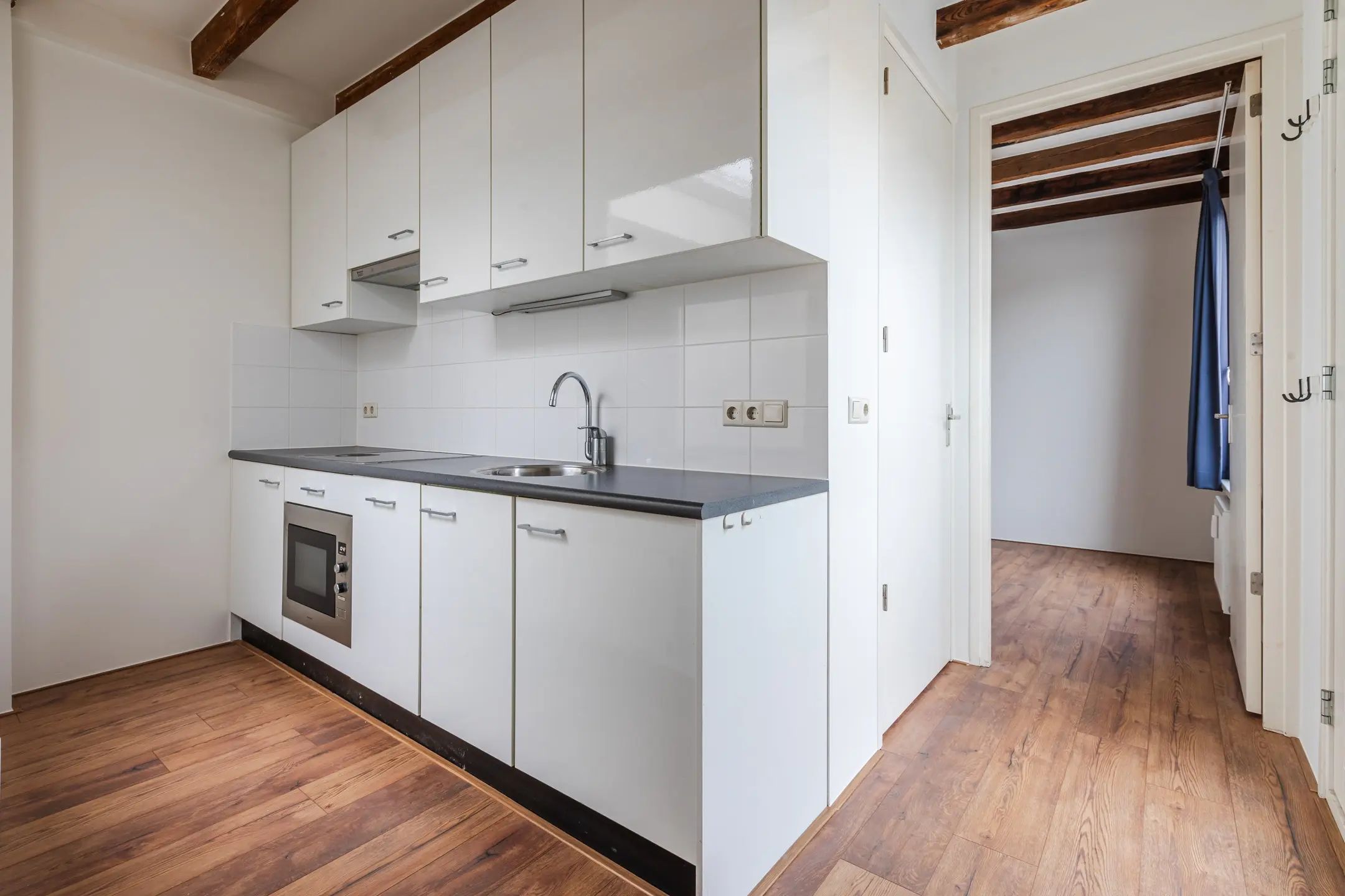 Half open keuken met inbouwapparatuur. Ruime slaapkamer, badkamer met een douche en wastafel.