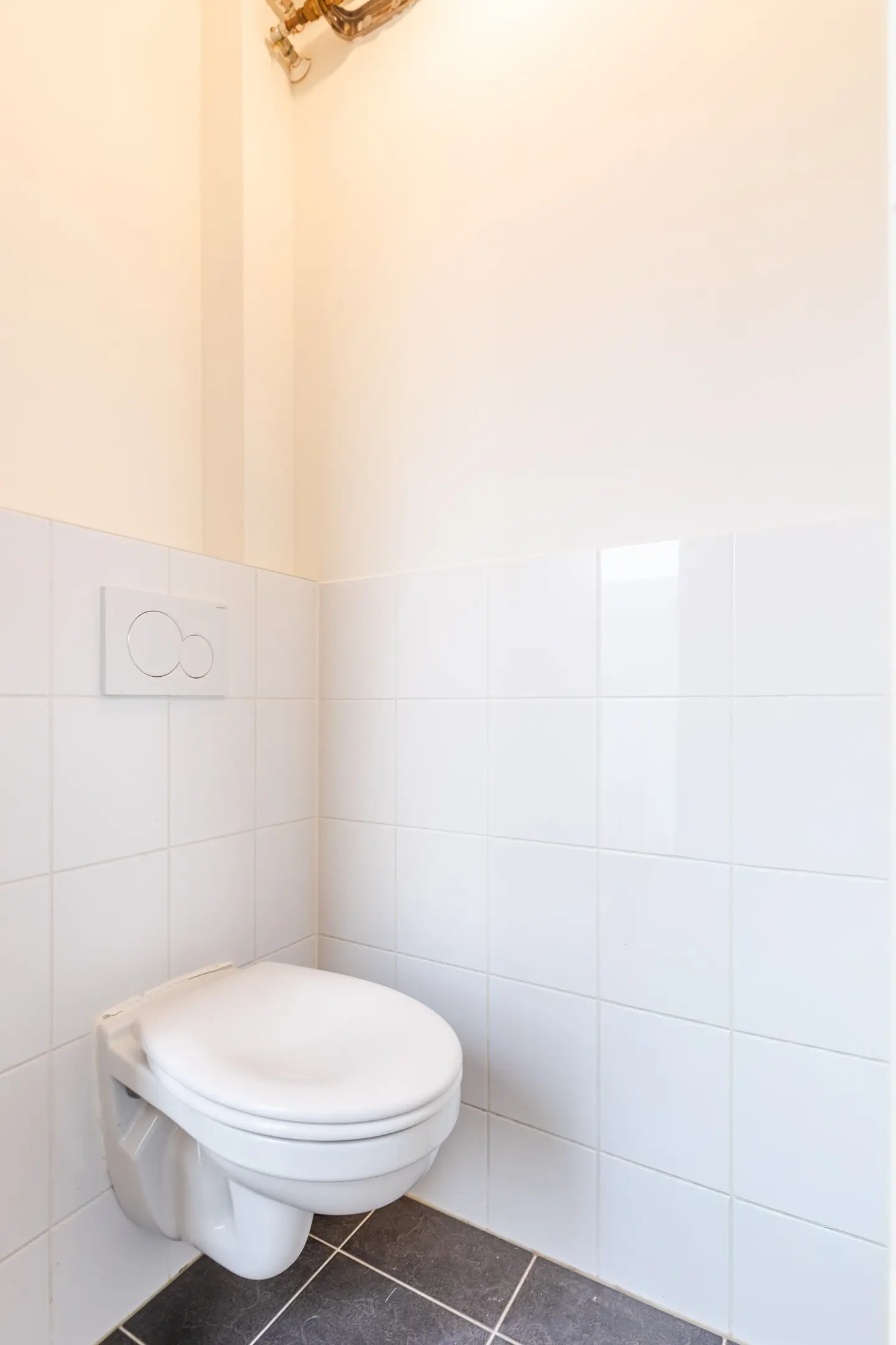 Privé-entree met een lange hal, separaat toilet met hangend closet.