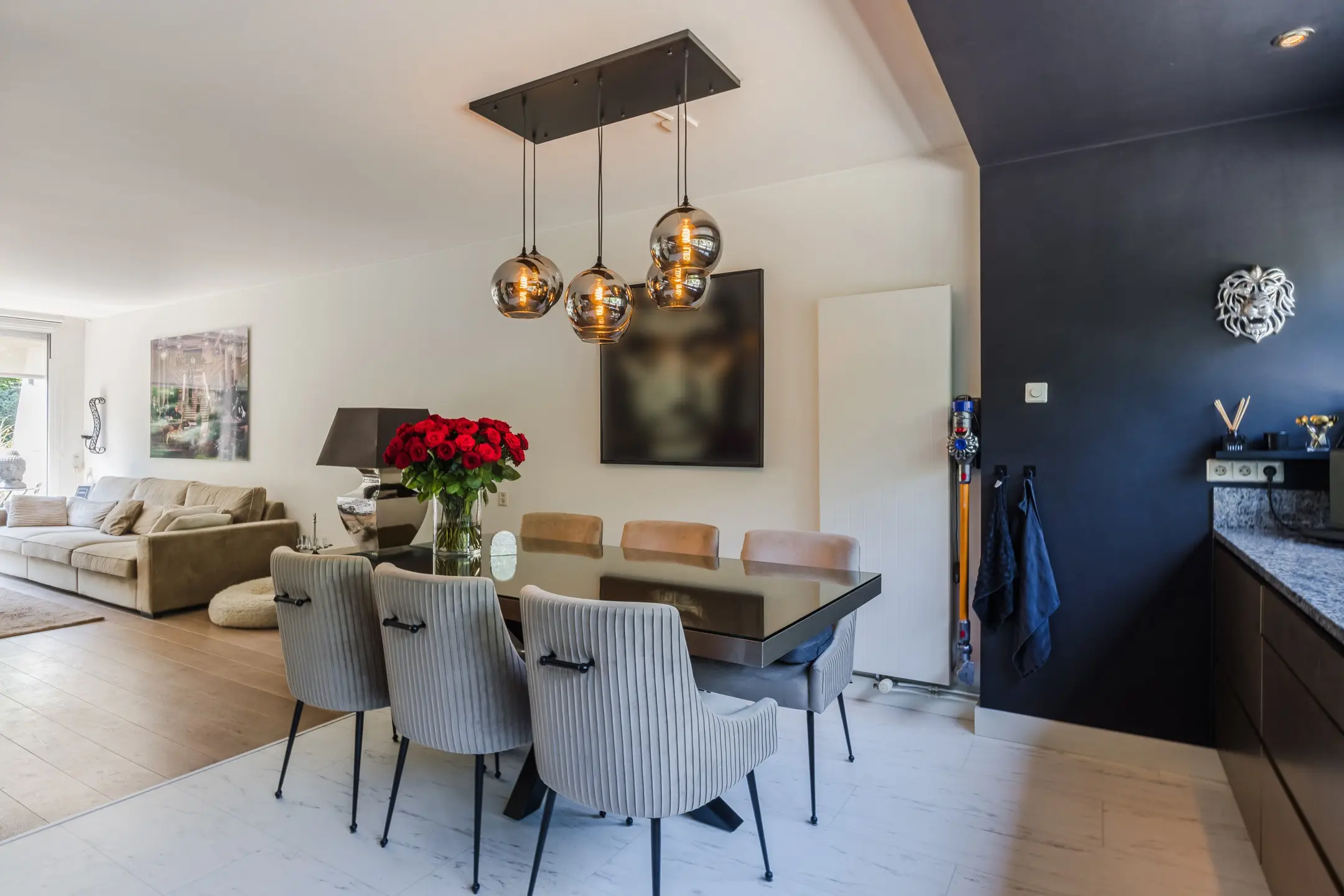 Overloop met toegang tot de ruime living en leefkeuken, voorzien van moderne inbouwapparatuur, waaronder een Quooker en een aparte wokbrander. De keuken is gesitueerd aan de uitgebouwde voorzijde, waardoor een fraaie, lichte ruimte is ontstaan. Aan de achterzijde bevindt zich een schuifpui naar het zonnige balkon.