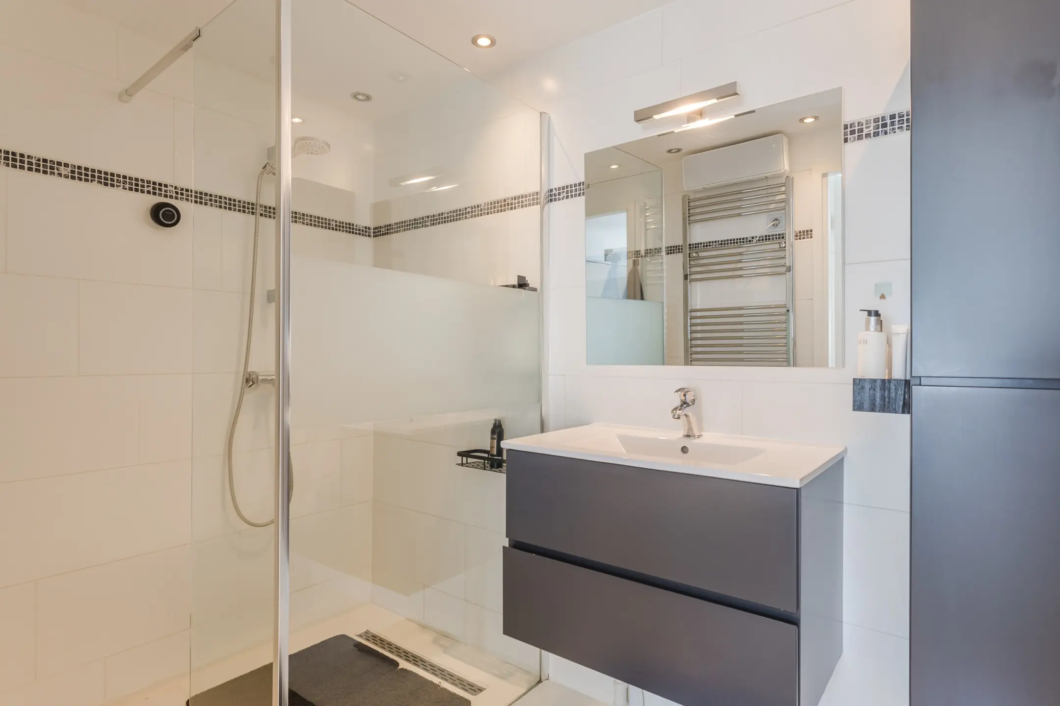 De badkamer is uitgerust met inloopdouche, wastafelmeubel en designradiator.