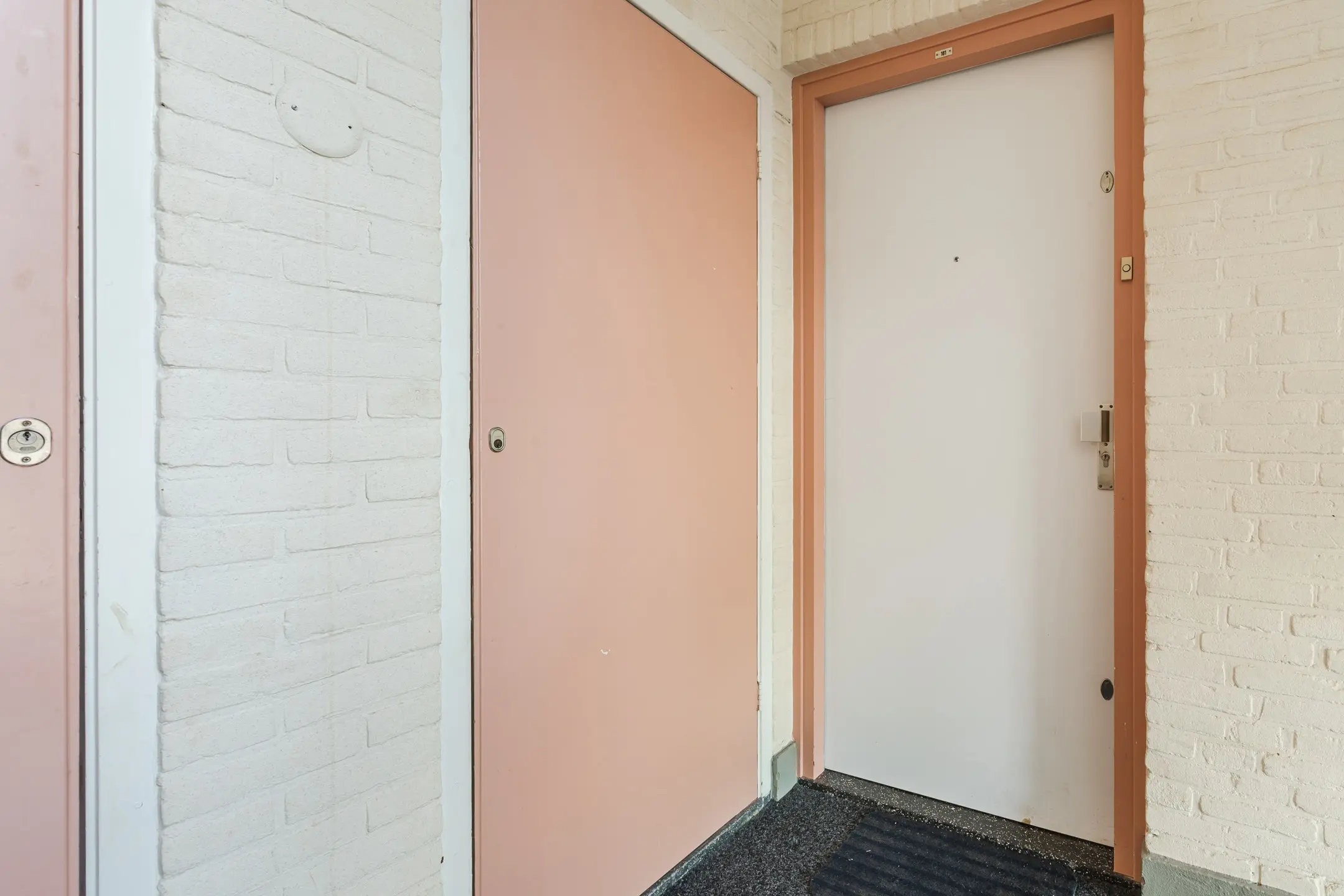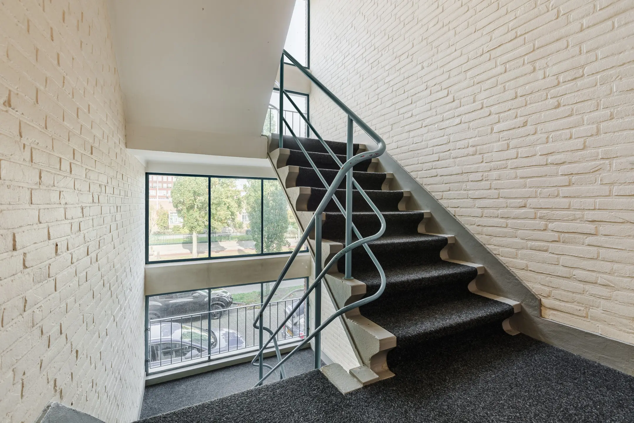 Entree, bellentableau, intercom, brievenbussen en trappenhuis.