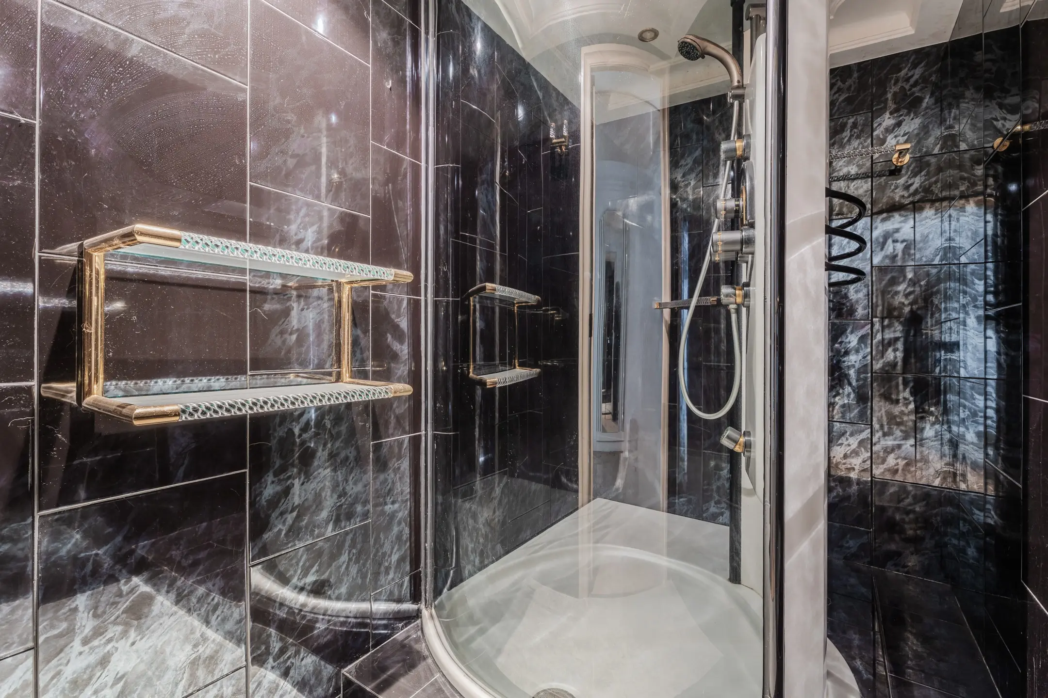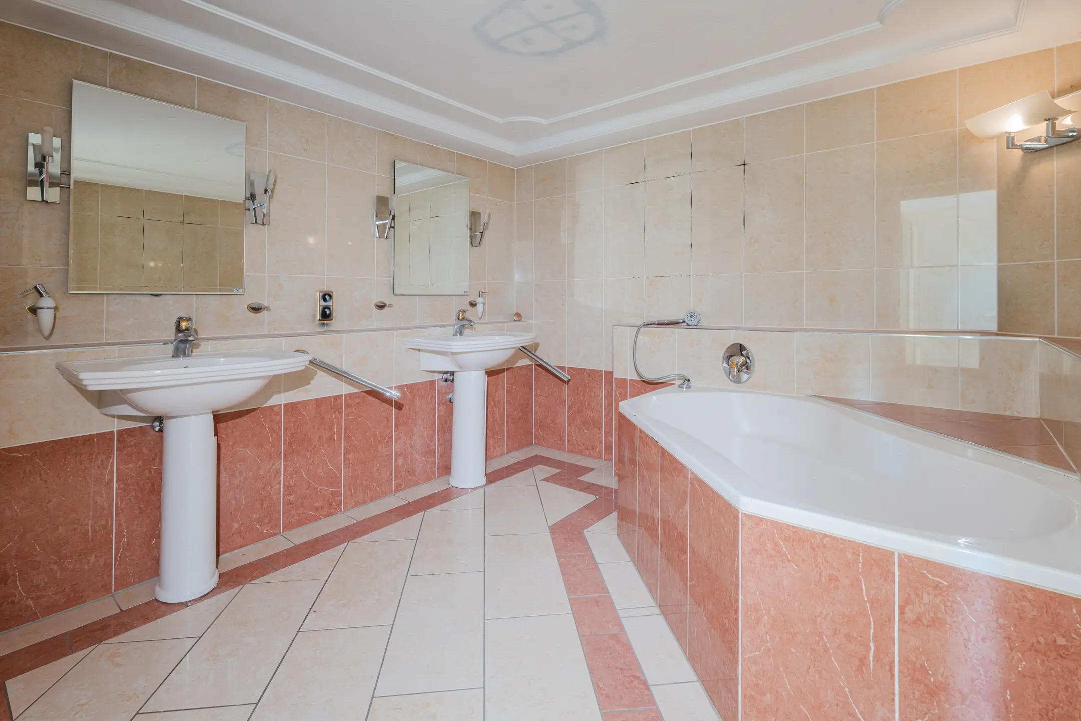 Ruime overloop, toilet met fonteintje, slaapkamer I met balkon en een inloopkastenkamer, badkamer met ligbad en 2 wastafels, slaapkamer II, slaapkamer III met balkon, 2e badkamer met douche.