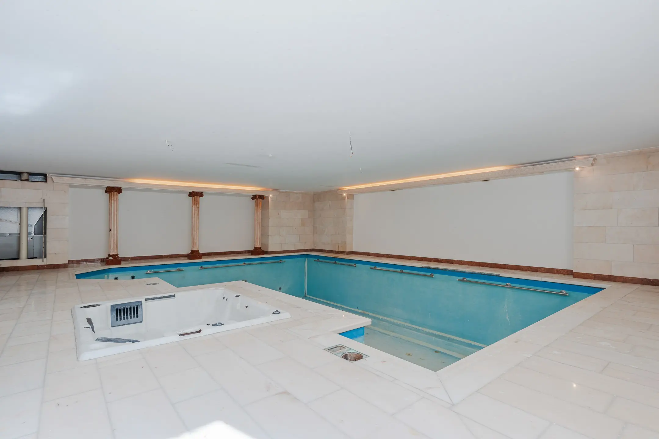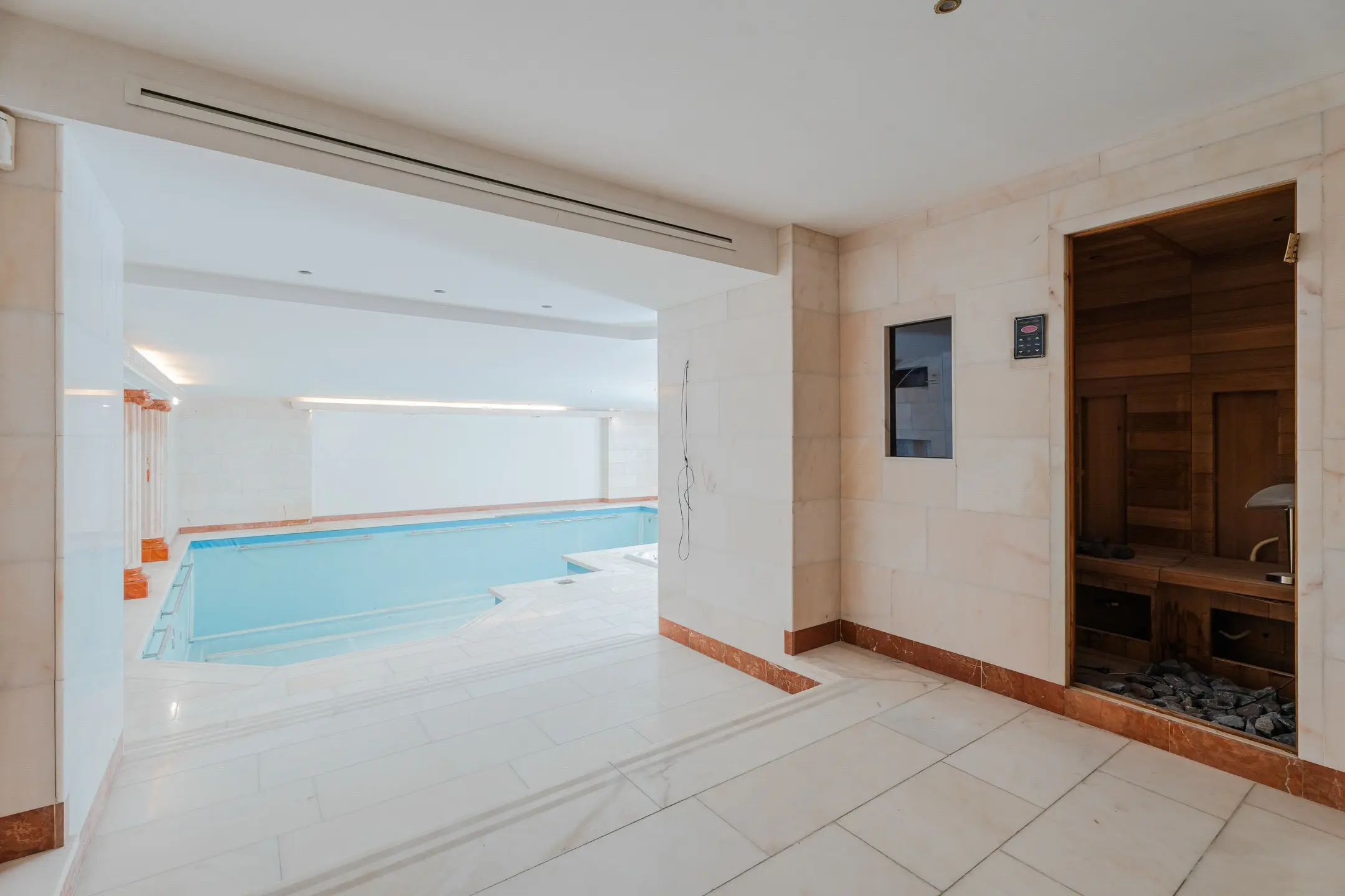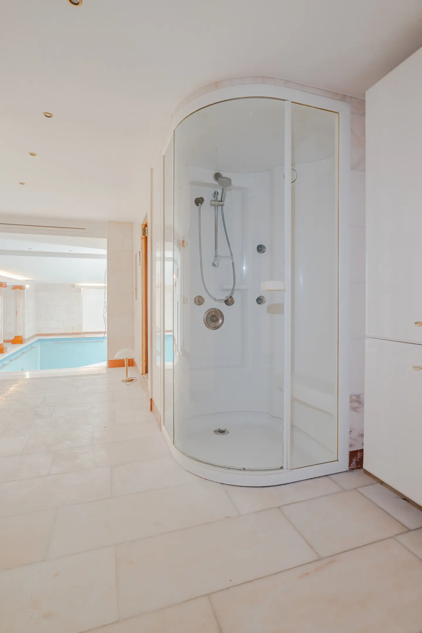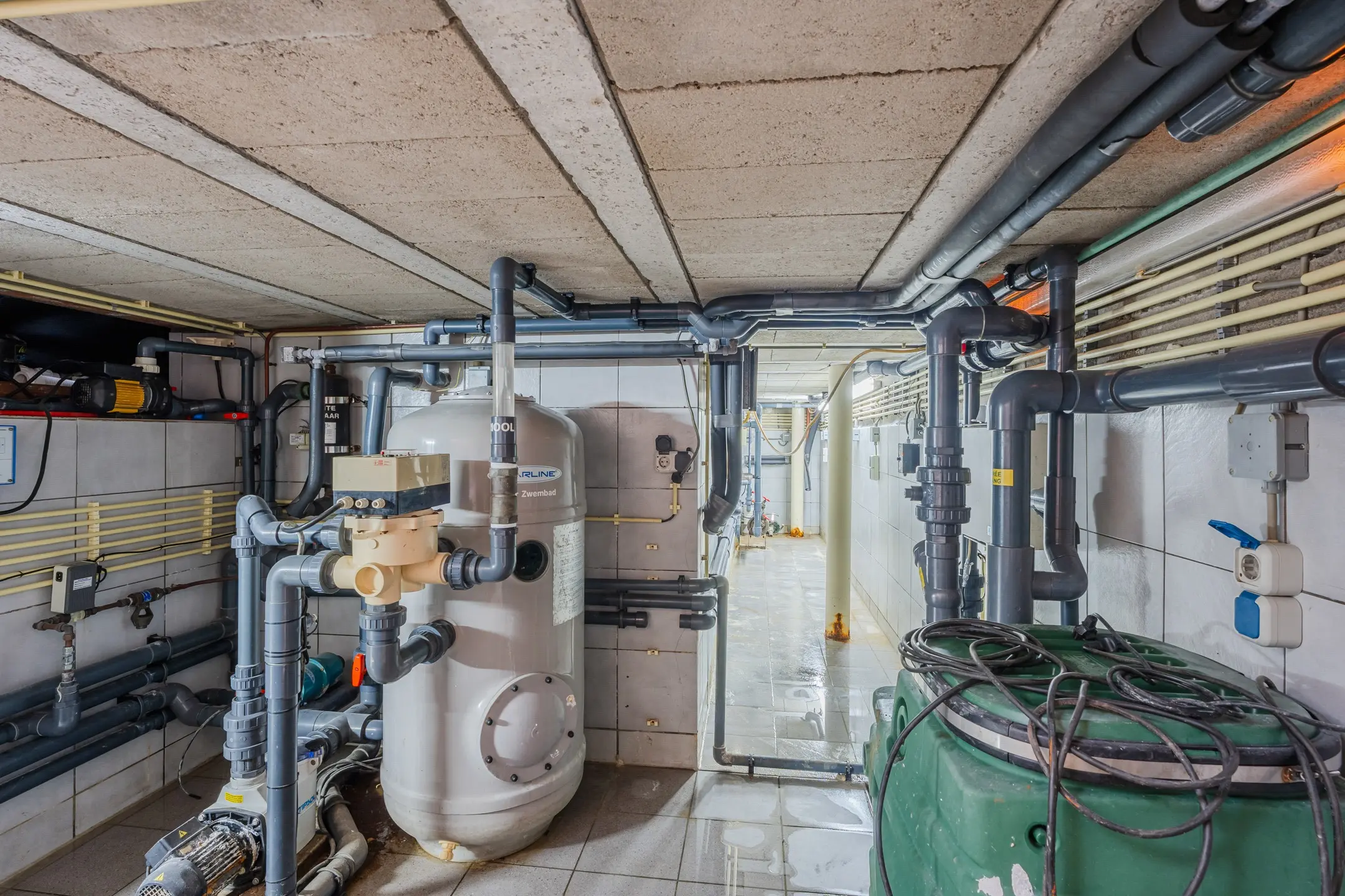 Hal, toilet met fonteintje, ruime kamer (multifunctionele ruimte), wasruimte/keuken met wasmachineaansluiting, ruime berging, stoombad, douche, sauna en jacuzzi en ruim zwembad.