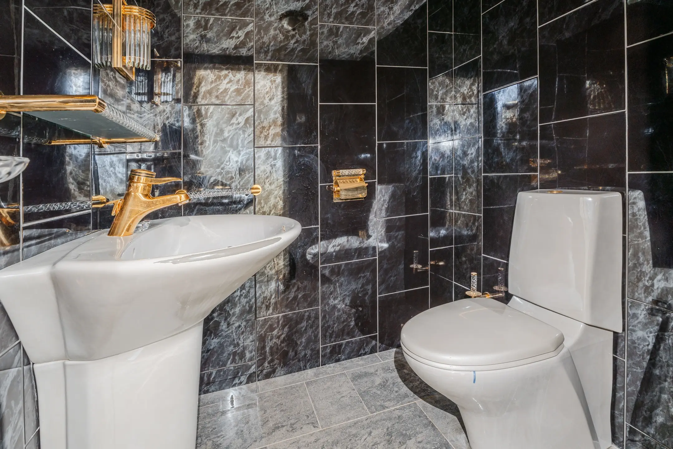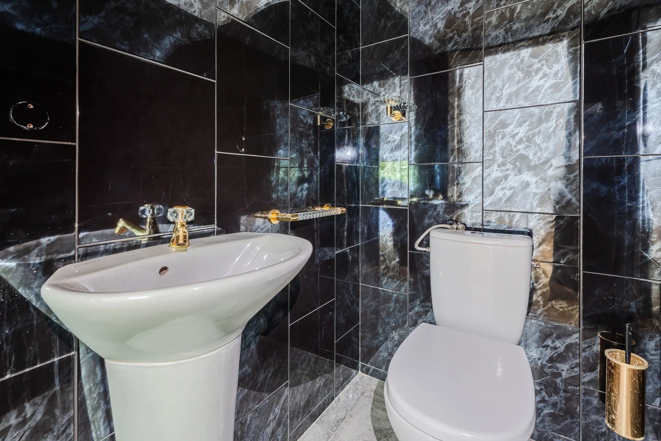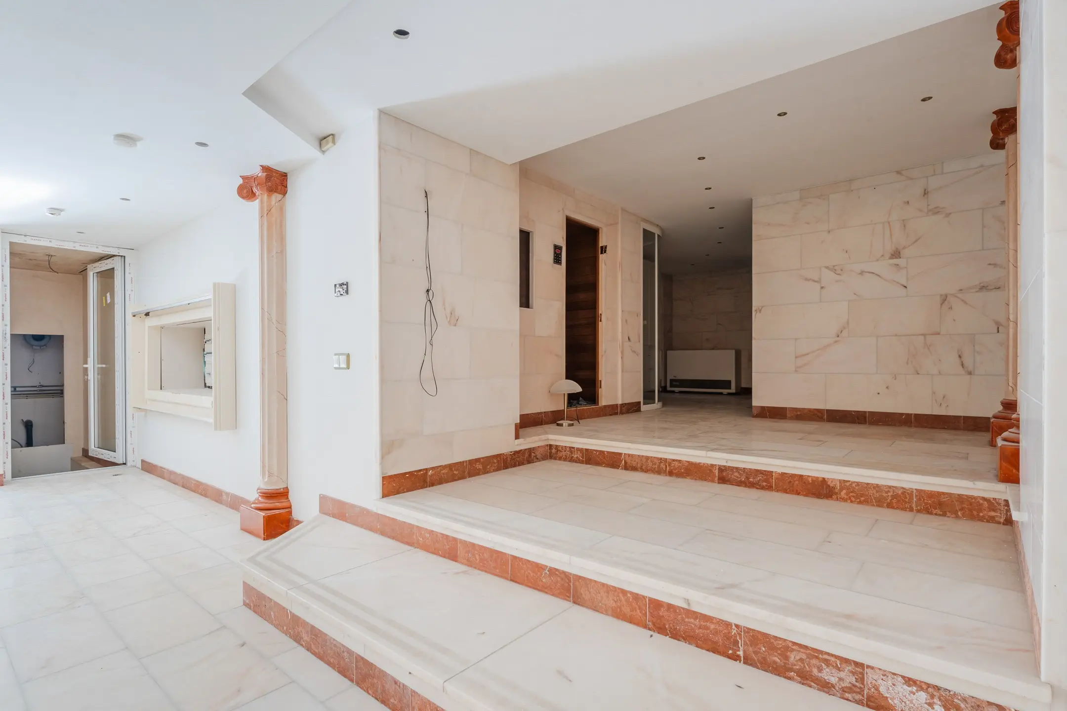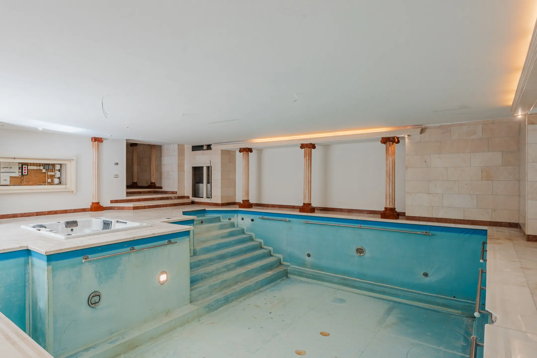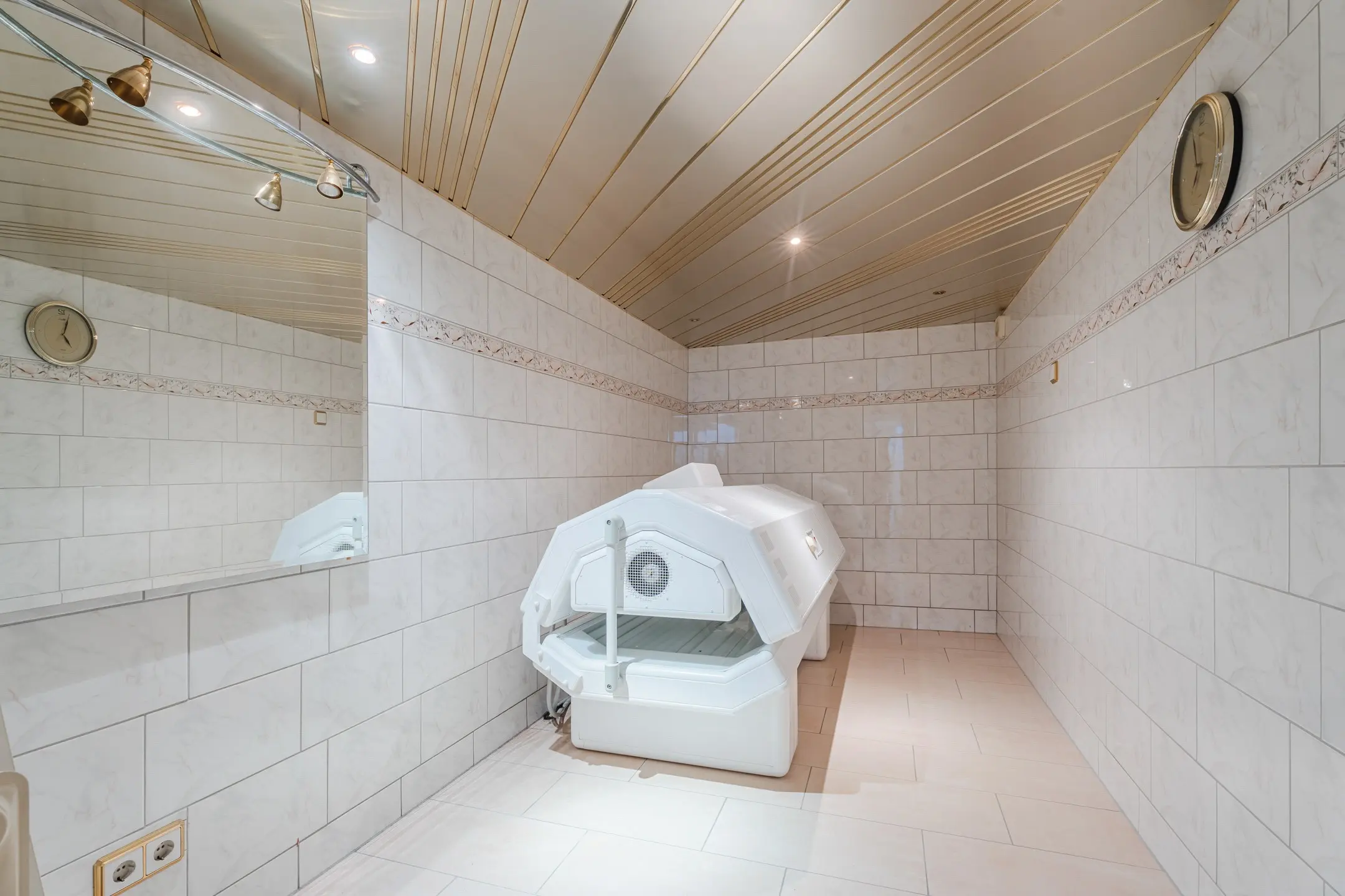 Hal, toilet met fonteintje, ruime kamer (multifunctionele ruimte), wasruimte/keuken met wasmachineaansluiting, ruime berging, stoombad, douche, sauna en jacuzzi en ruim zwembad.