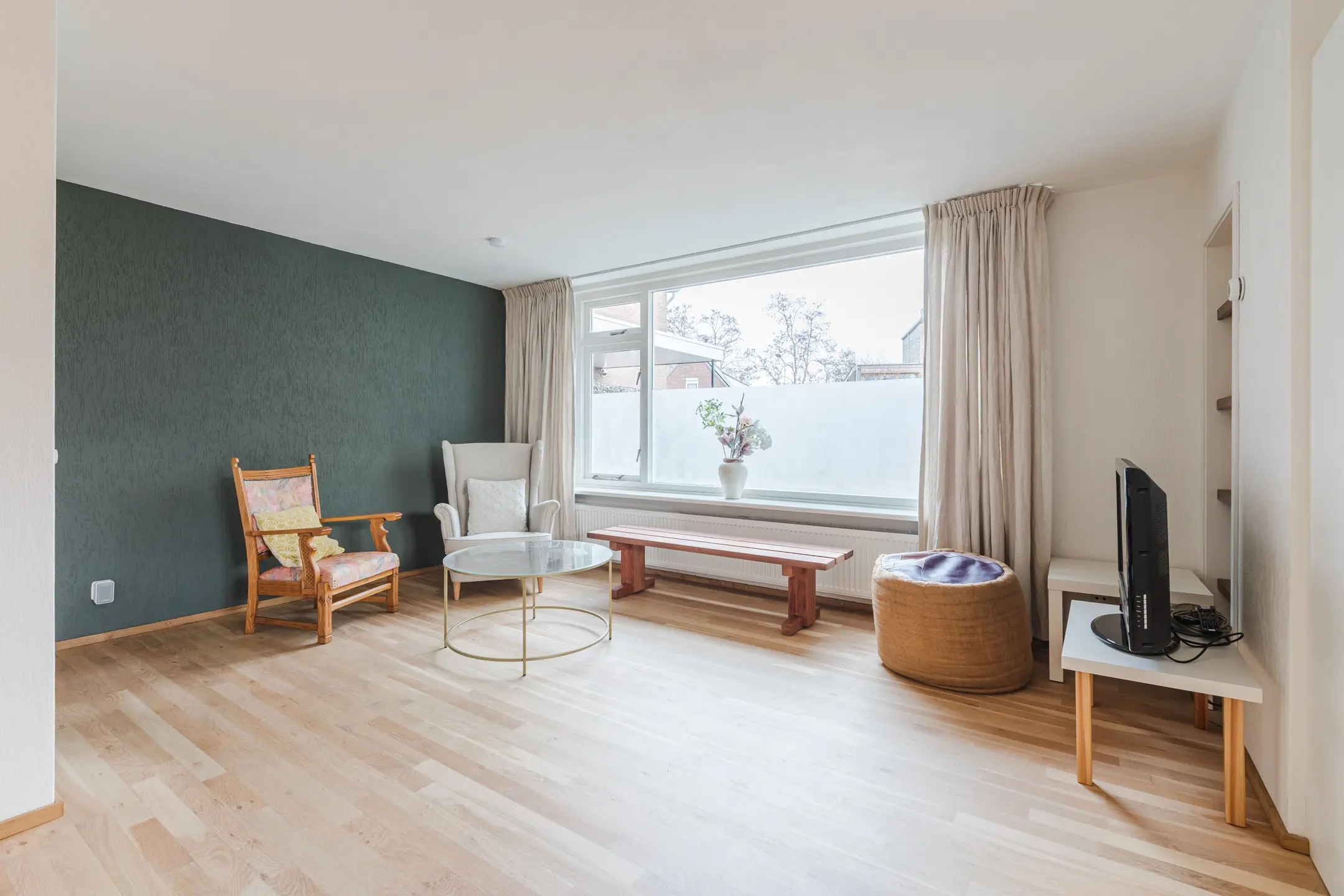 De lichte woonkamer beschikt over een vaste kast, airconditioning (koelen en verwarmen) en een open haard.
